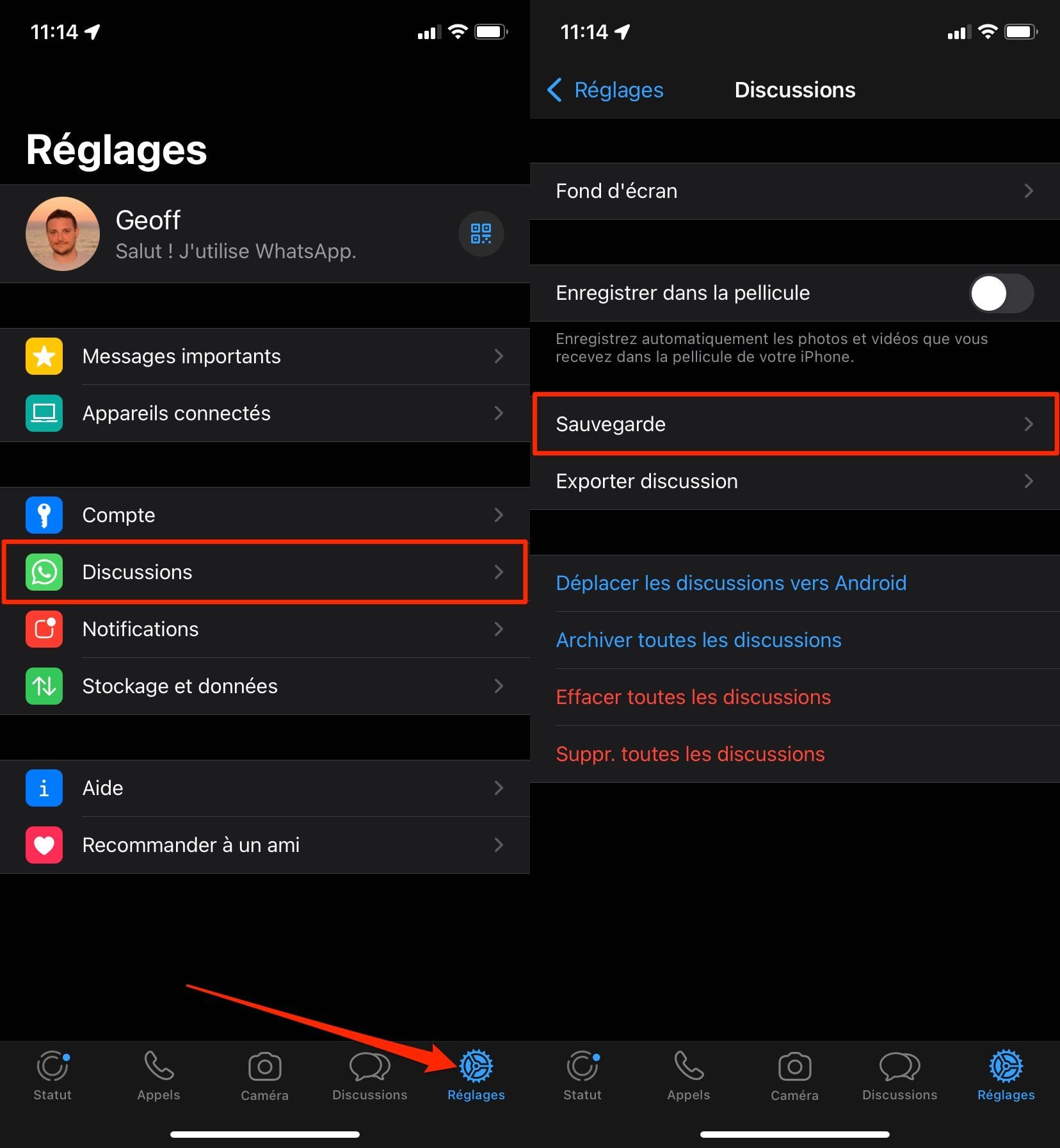 Lancez WhatsApp et rendez-vous dans les Paramètres de l’application (sur Android, menu options, figuré par trois petits points en haut à droite de l’écran). Entrez ensuite dans le menu Discussions et rendez-vous dans Sauvegarde.