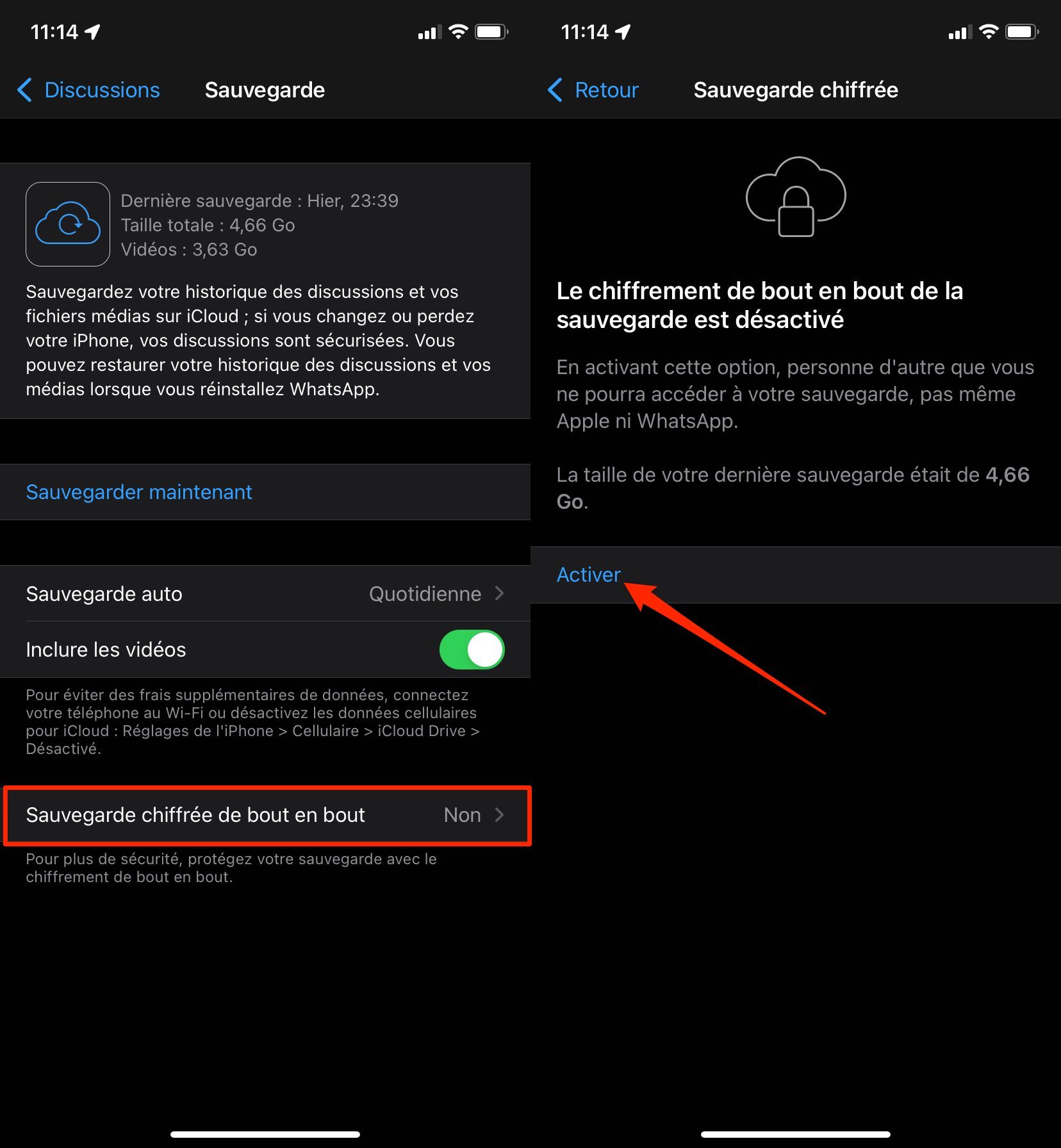 Accédez désormais au menu Sauvegarde chiffrée de bout en bout et appuyez sur le bouton Activer.
