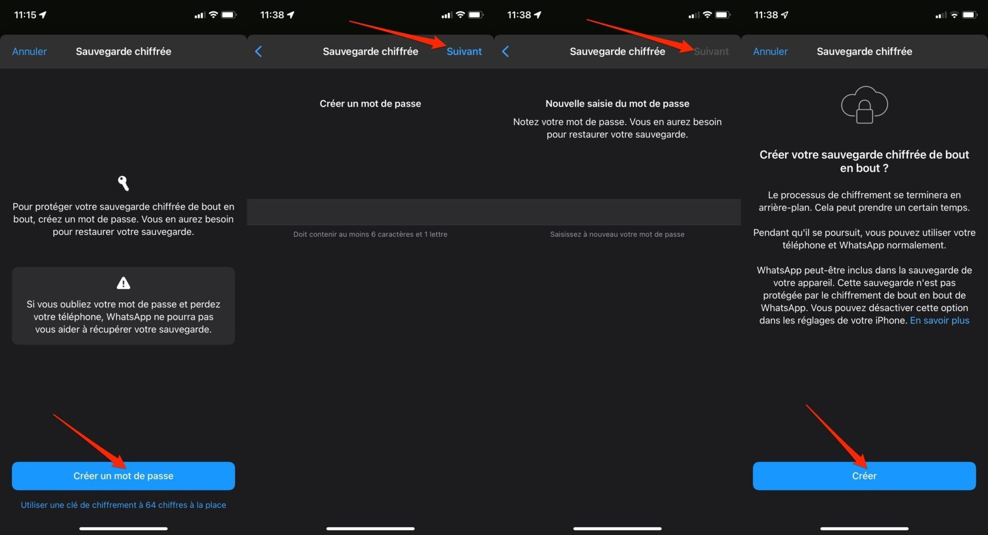 Si vous optez pour Créer un mot de passe, saisissez une première fois votre mot de passe et appuyez sur Suivant. Confirmez ensuite votre mot de passe en le saisissant une seconde fois et appuyez de nouveau sur Suivant. Appuyez enfin sur le bouton Créer pour lancer la création de votre sauvegarde chiffrée de bout en bout.