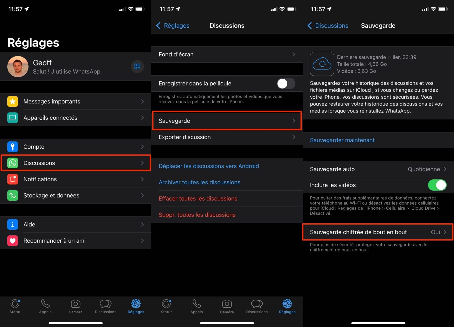 Si pour une raison ou pour une autre, vous souhaitez désactiver le chiffrement de bout en bout de votre sauvegarde, accédez aux Paramètres de WhatsApp, entrez dans Discussions, puis dans Sauvegarde entrez dans Sauvegarde chiffrée de bout en bout.