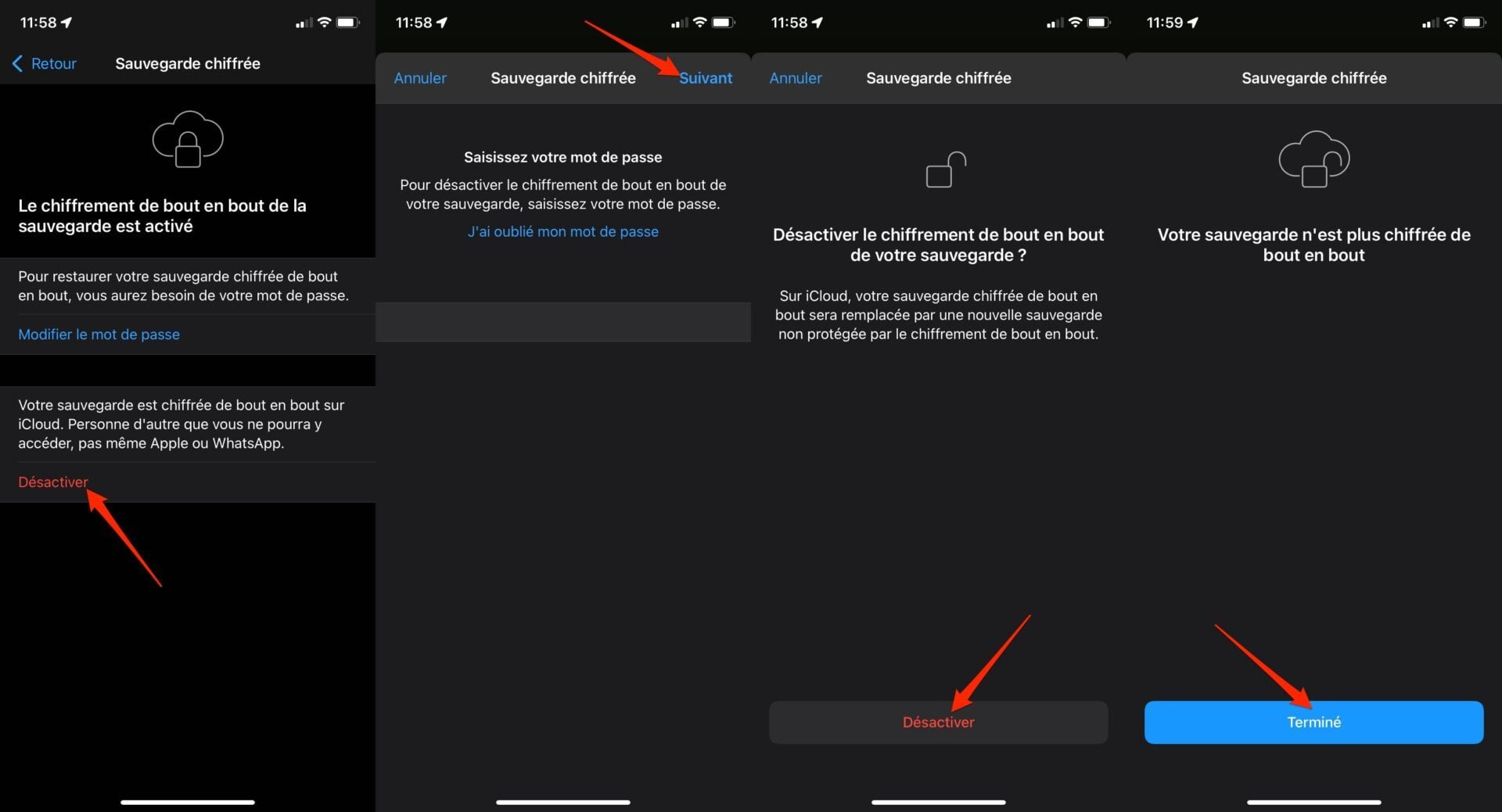 Appuyez enfin sur le bouton Désactiver puis sur Terminé. Avant d’activer le chiffrement de votre sauvegarde WhatsApp, gardez bien en tête que la plate-forme ne peut pas réinitialiser ni votre mot de passe, ni la clé de chiffrement, puisqu’elle n’en possède aucune copie.