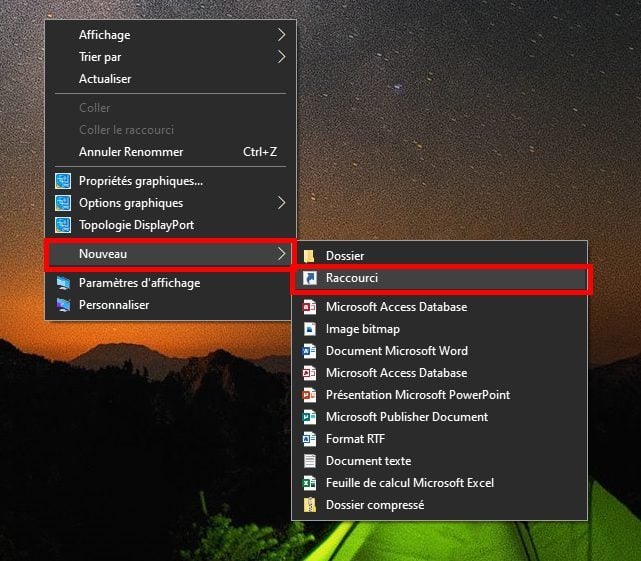 Faites ensuite un clic droit sur le bureau, puis dans Nouveau, choisissez Raccourci.