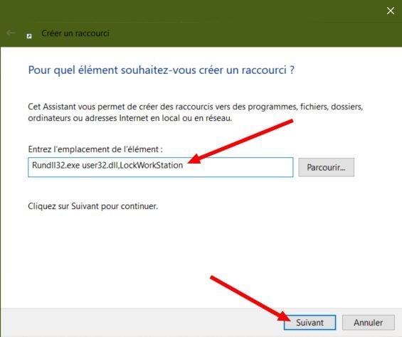 Dans la fenêtre Créer un raccourci qui s’affiche copiez-collez la commande suivante dans le champ Entrez l’emplacement de l’élément :