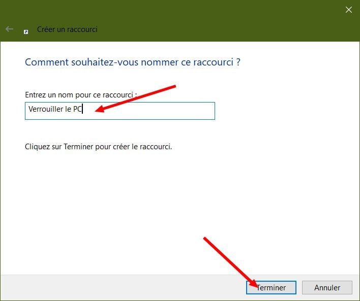 Pour finaliser votre raccourci, donnez-lui un nom, « Verrouiller le PC », par exemple. Cliquez enfin sur le bouton Terminer pour valider la création de votre raccourci.