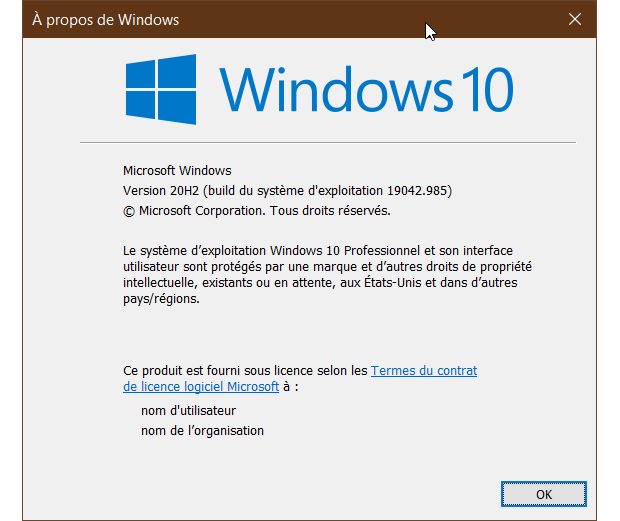 Une fenêtre devrait s’afficher et indiquer votre version de Windows 10 : Version 2004 ou 20H2.