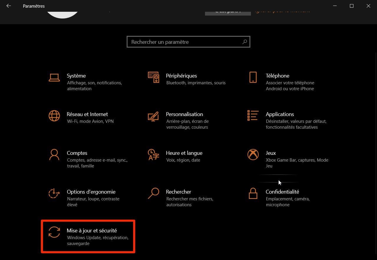 Dans le panneau des Paramètres de Windows 10, cliquez sur le menu Mise à jour et sécurité.
