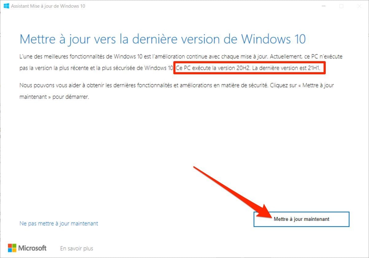 Dans la fenêtre Mettre à jour vers la dernière version de Windows 10 qui s’affiche, vérifiez que l’Assistant vous propose bien la version 21H1, et cliquez sur le bouton Mettre à jour maintenant.