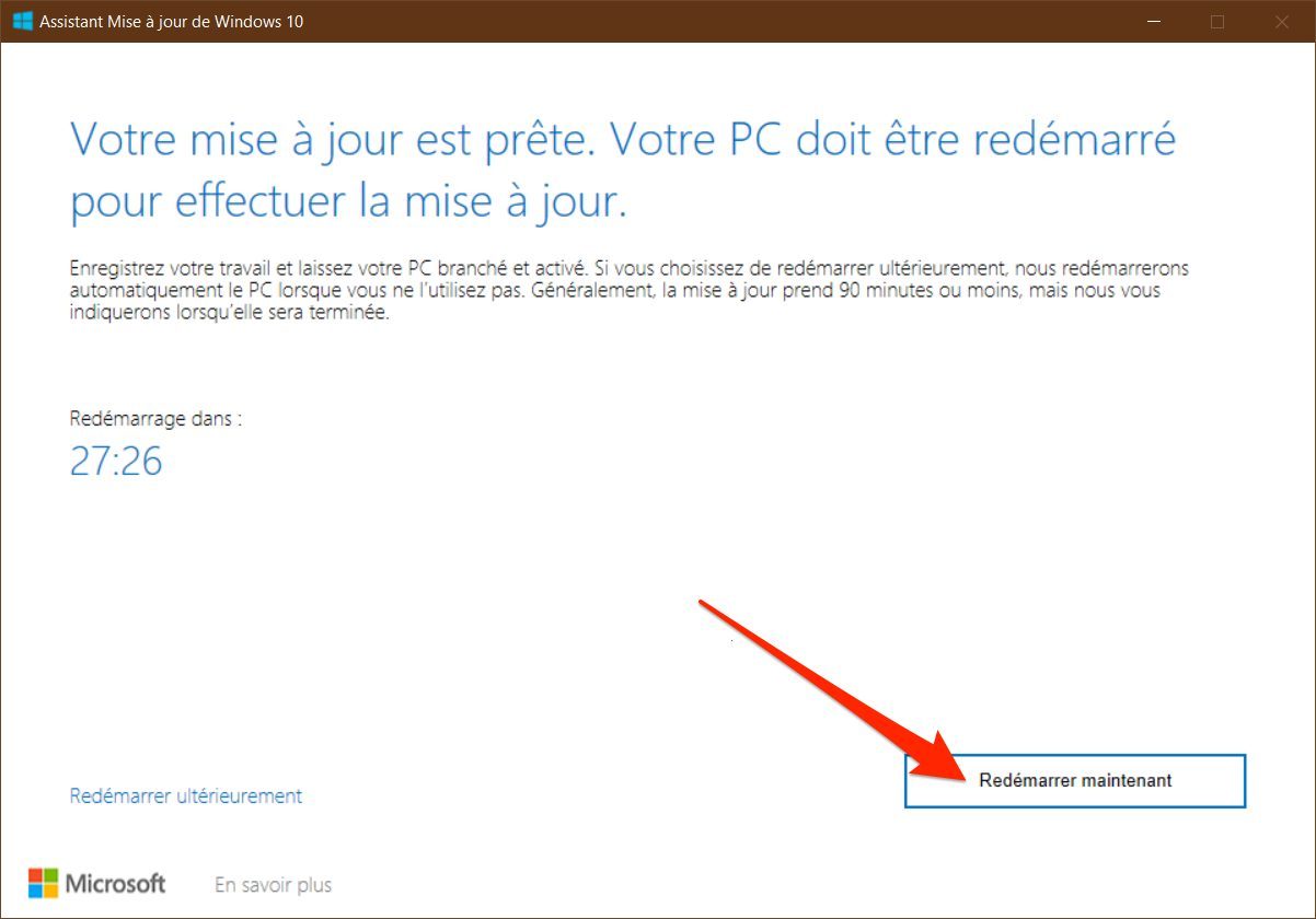 Lorsque l’Assistant de mise à jour a terminé son opération, il vous sera demandé de Redémarrer l’appareil. Cliquez sur le bouton idoine pour redémarrer votre machine et finaliser l’installation de la mise à jour.