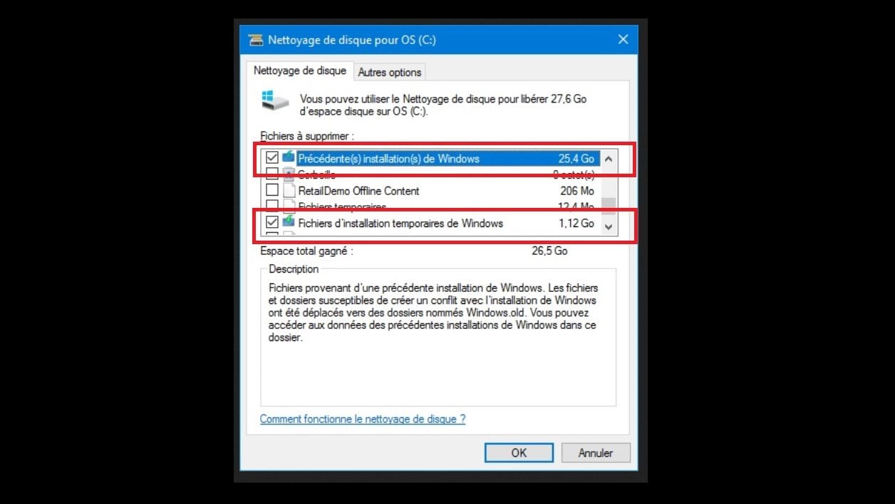 Une nouvelle liste s’affiche. Cochez alors juste la case « Précédente(es) installation(s) de Windows » pour supprimer le dossier « Windows.old ». Vous pouvez aussi cocher la case « Fichiers d’installation temporaires de Windows » pour supprimer des fichiers qui ont servi pour l’installation de la mise à jour anniversaire et sont dans le dossier « $WINDOWS.~BT » (environ 1,1 Go sur le disque dur).
