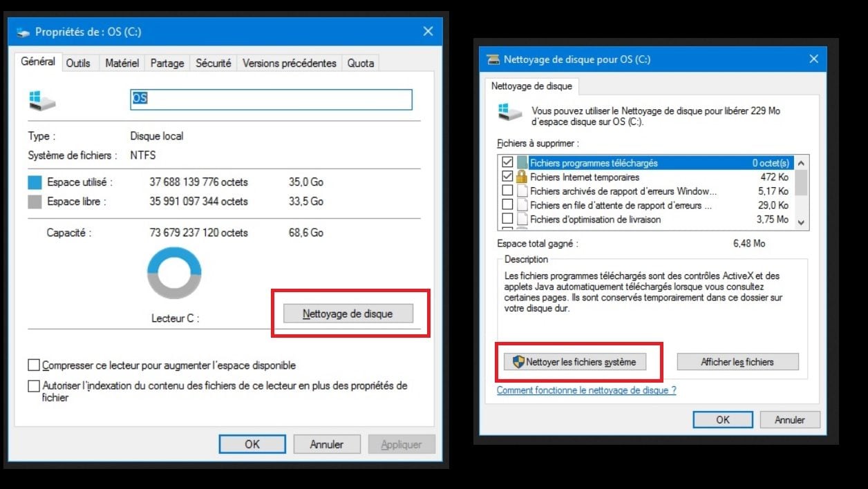 Cliquez ensuite sur le bouton « Nettoyage de disque ». Après quelques minutes, l’outil de nettoyage affiche une liste d’éléments. Cliquez alors sur le bouton « Nettoyez les fichiers système ».