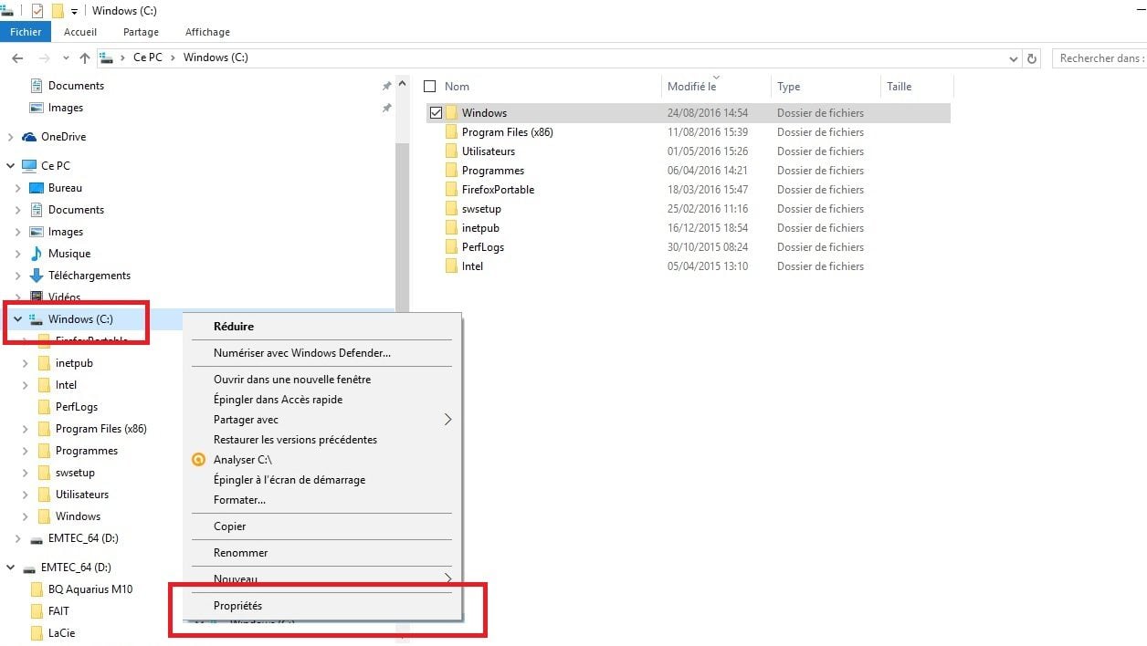 Pour accéder à l’outil de nettoyage des disques de Windows, il faut passer par l’explorateur de fichier (touches Windows + E). Dans l’arborescence, cliquez avec le bouton droit sur le disque C: et sélectionnez Propriétés dans le menu déroulant.