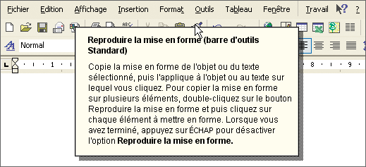 peu plus.Déroulez Outils, Personnaliser. Dans la zone Catégorie, choisissez Toutes les commandes.Déroulez la liste Commandes du volet de droite et sélectionnez AideOutil. Faites glisser cet élément sur une de vos barres d’outils et cliquez sur Fermer.Désormais, pour connaître la signification d’un bouton quelconque, cliquez sur le bouton que vous venez d’ajouter, puis sur le bouton en question. Une fenêtre affiche son rôle de façon beaucoup plus détaillée que l’infobulle précitée.