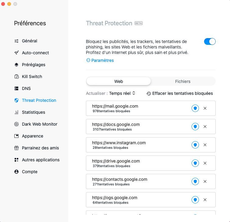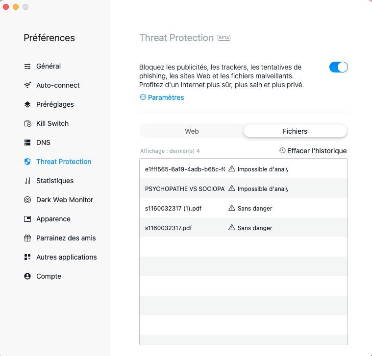 De même, tous les fichiers que vous téléchargez et les pièces jointes de vos mails sont analysés par l’outil. De manière transparente et non intrusive, NordVPN analyse le fichier. S’il est sans danger, vous pouvez continuer sans être dérangé dans votre flux. S’il est dangereux, il est supprimé automatiquement avant même qu’il ait pu vous nuire.
