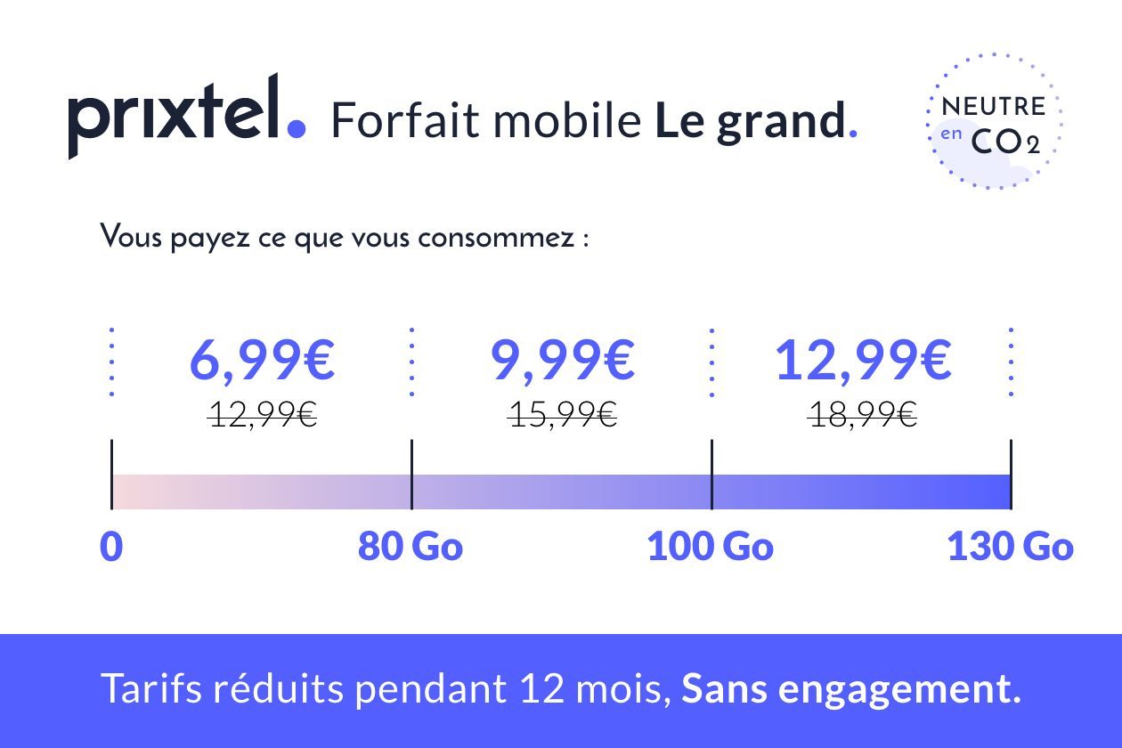 Si vous ne vous considérez ni comme un énorme consommateur de données mobiles, ni comme un utilisateur très occasionnel de votre smartphone, vous avez sans doute besoin d’un forfait proposant une quantité de données suffisante pour des usages essentiels comme les mails, réseaux sociaux, le streaming audio ou un peu de partage de connexion. 80 Go devraient largement convenir dans votre cas. Justement, Prixtel propose une promotion sur son forfait Le grand pendant les soldes d’hiver 2022. Pour seulement 6,99 euros, le forfait Prixtel Le grand vous permet de profiter de 80 Go de données et d’appels, SMS et MMS illimités. Mais ce n’est pas tout, il est flexible et sans engagement.
