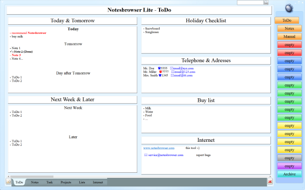 Notesbrowser est un organiseur professionnel. Il offre un nombre impressionnant d'utilisations en entreprise ou chez soi: comme planificateur de projets mais également pour les vacances, les hobbies, les tâches quotidiennes, etc. Il comprend un calendrier et de nombreux champs dans lesquels on peut intégrer, gérer et exécuter des listes de tâches à réaliser, d'adresses Internet (Favoris) et de MP3 ou toute autre donnée de votre choix. Une fonction de recherche intégrée se charge de retrouver très rapidement l'entrée désirée. Plusieurs skins sont à votre disposition pour personnaliser l'interface de votre programme. De plus, la fonction de sauvegarde automatique enregistre sans aucune intervention de votre part toutes vos modifications. Le programme a été développé pour une utilisation particulièrement simple.
