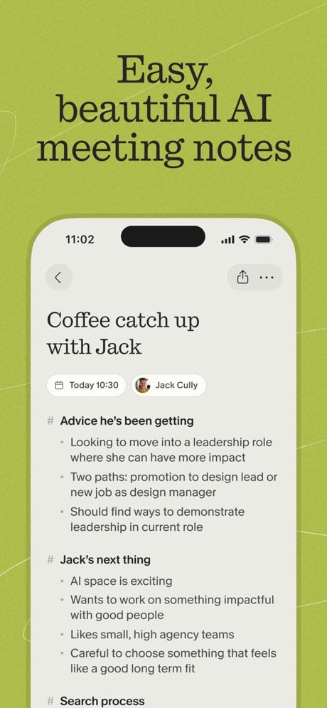 Cette logique diffère des assistants qui restituent un script intégral : Granola isole les points importants et les rend directement utilisables sans travail de mise en forme supplémentaire. Le produit fonctionne sur ordinateur et iPhone, s'intègre à Google Workspace ou Microsoft, et n'introduit aucun assistant tiers dans l'appel.
