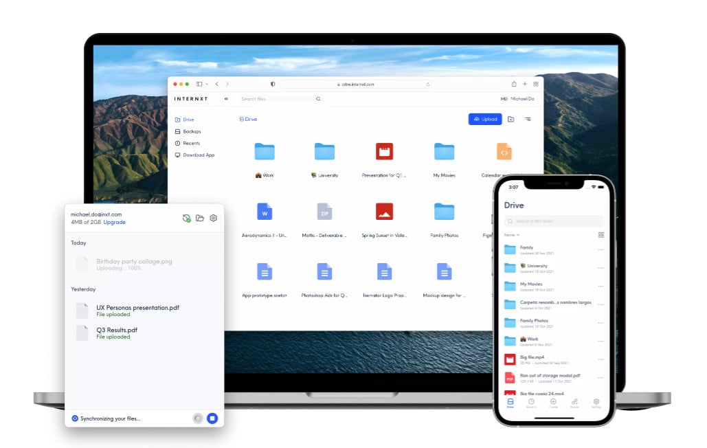 Pour une expérience optimale sur ordinateur, il est recommandé d’installer l’application de bureau, qui crée un dossier synchronisé. Tout document placé dans ce répertoire est instantanément sauvegardé sur le cloud et devient accessible sur tous vos autres appareils. Sur mobile, Internxt Drive permet de consulter vos documents en déplacement et propose une fonctionnalité de sauvegarde automatique des photos. De cette manière, vous pouvez facilement libérer de l’espace de stockage sur votre téléphone.
