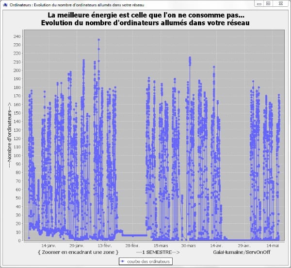 ServOnOff est un logiciel de gestion énergétique conçu pour réduire la consommation électrique des parcs informatiques. Développée par la société Gaia Humaine, cette solution s’inscrit dans une démarche Green IT. Elle répond aux enjeux de la réduction de l’empreinte environnementale du numérique, notamment dans le cadre de la loi REEN. Pour ce faire, ce logiciel Windows agit directement sur les ordinateurs d’un réseau. Il permet d’automatiser les mises en veille, les extinctions ou les démarrages selon des règles définies par l’administrateur.