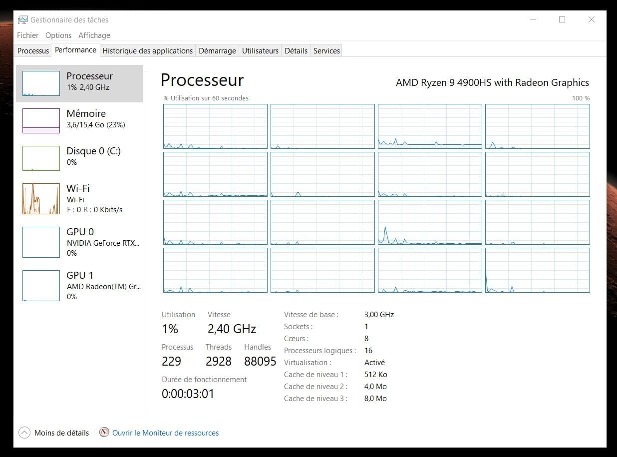 Un outil de mesure de performance qui pousse le CPU dans ses retranchements. Où plutôt les CPU puisque avec ses 8 cœurs physiques capables de gérer 16 tâches simultanément, le Ryzen 9 4900 HS envoie du lourd, avec un score maximal de 4168 points.