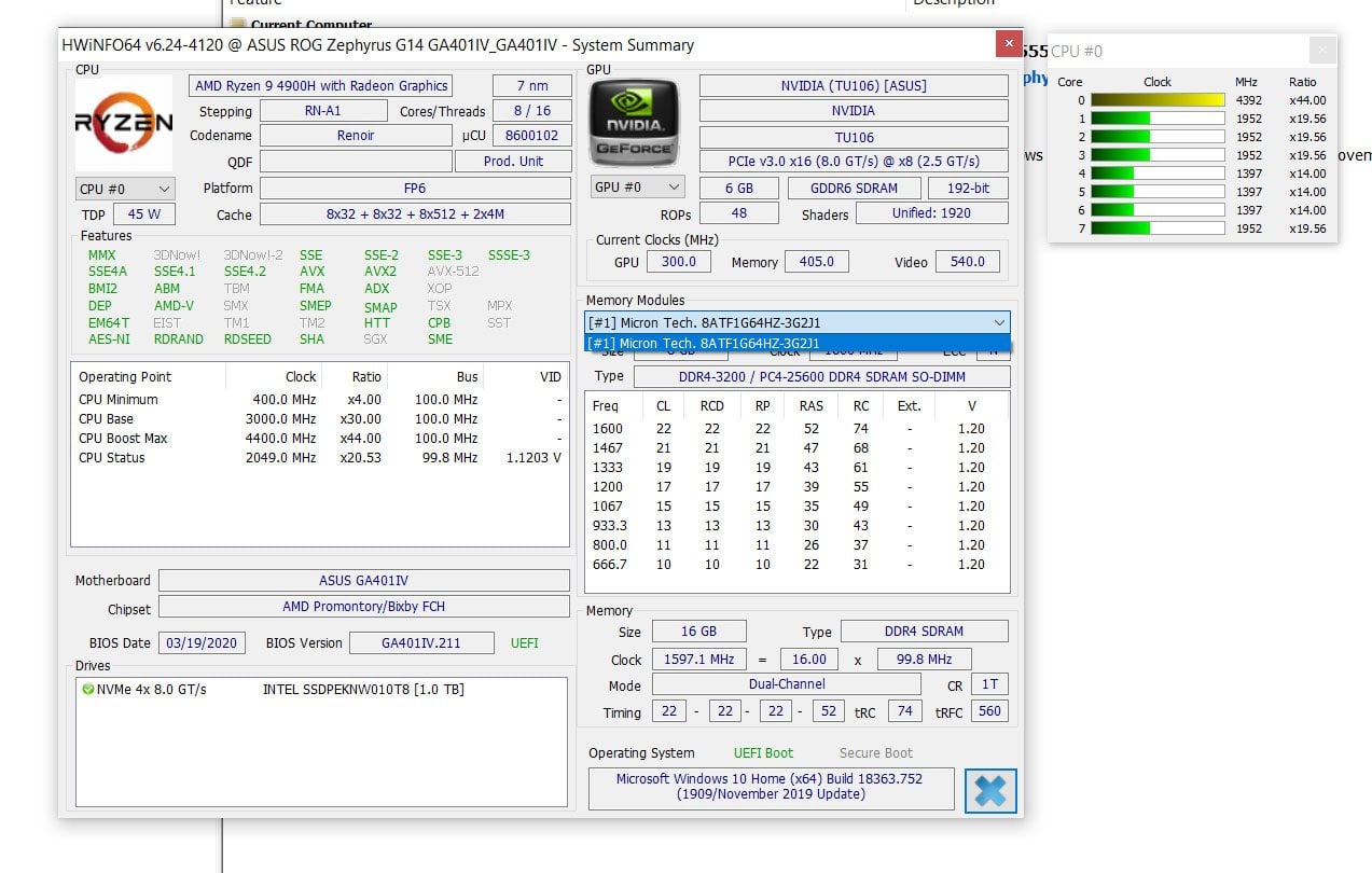 Annoncé au CES 2020 en janvier dernier, le Zephyrus G14 est la première machine à avoir été annoncée avec les puces mobiles de nouvelle génération d’AMD, les Ryzen 4000. Des puces qui sont, sur le papier, les premiers vrais processeurs de laptop signés AMD à pouvoir tenir tête, voire carrément éclipser les Core d’Intel, archi-dominant sur le segment des PC portables. Profitant d’une finesse de gravure de 7 nm, ces SoC ont tout pour plaire : ils embarquent beaucoup de cœurs, montent bien en fréquence et intègrent une puce graphique Radeon Vega qui permet déjà de commencer à bien jouer.
