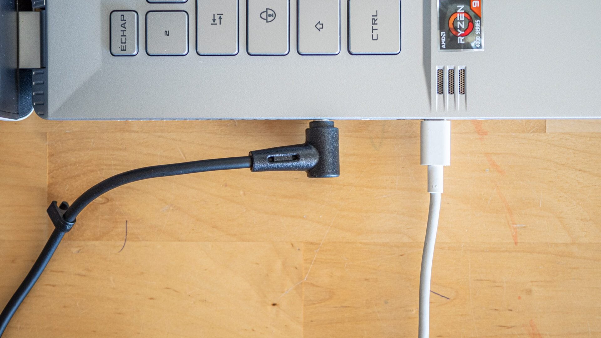 Le chargeur 180 W livré avec le PC n’est pas très lourd (545 g avec son gros câble), mais vous pouvez voyager encore plus léger avec le Zephyrus G14 si vous disposez d’un chargeur de type USB C. Avec un modèle d’au moins 40 W, vous pouvez non seulement recharger la batterie appareil éteint (même si la charge est plus longue qu’avec le chargeur de base) voire travailler normalement sur secteur, pourvu que vous ne lanciez pas de jeux ou d’application faisant appel au GPU de Nvidia.