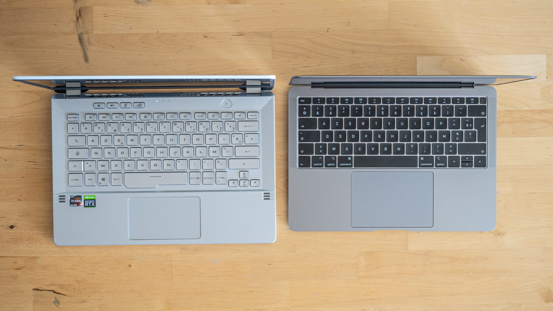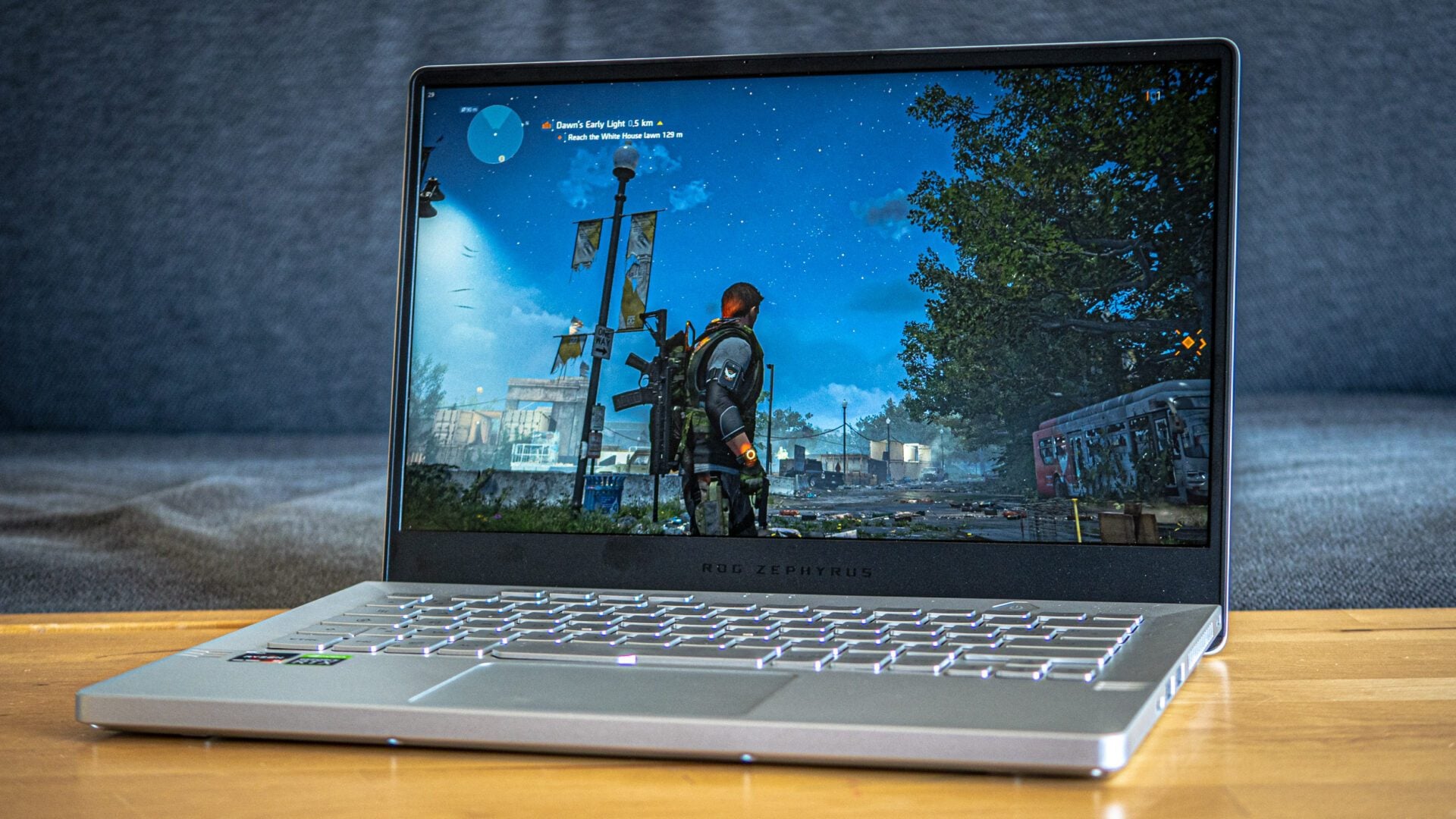 Le tout dans des enveloppes thermiques réduites : la puce qui équipe notre modèle de test n’est rien de moins que la plus haut de gamme des Ryzen 4000, le Ryzen 9 4900HS, une version exclusive à Asus pendant quelques mois, qui déploie autant de puissance que la 4000H… mais dont le TDP est réduit de 45 W à 35 W. Autrement dit le processeur mobile le plus puissant et le moins énergivore jamais lancé par AMD. Pour couronner le tout, Asus ajouté à ce super processeur une Nvidia RTX 2060 MaxQ. De quoi jouer à presque tous les titres AAA toutes options à fond en 1080p. Sans faire exploser la consommation électrique.