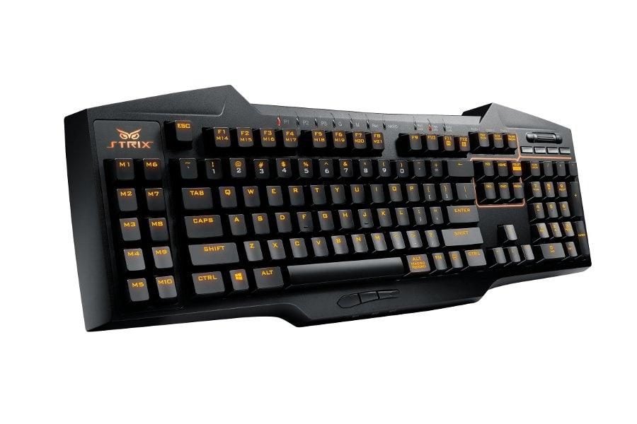 Le clavier Asus Stix Tactic Pro est tout noir et équipé de touches rétroéclairées (orange). Clavier de gamer oblige, une fonction anti-ghosting est présente (appui simultanée de plus de 6 touches sans bug) et Asus a implanté une dizaine de touches supplémentaires sur le côté gauche (plus trois sous la barre d'espace) pour programmer vos macros favorites. Retrouvez notre article sur la gamme Strix d'Asus.