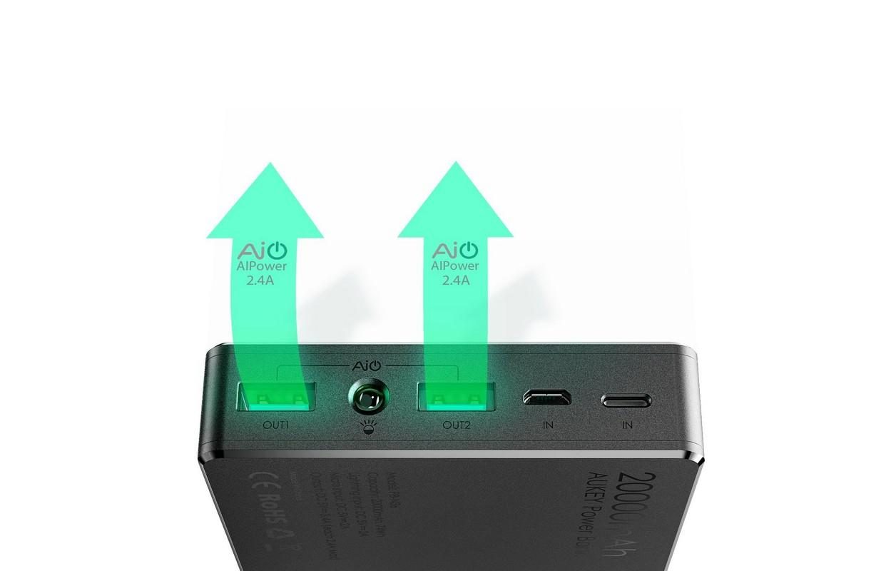 La batterie externe Aukey PB-N36 offre à l'utilisateur une solide capacité de 20000 mAH et intègre une lampe de poche. Elle est dotée de deux ports USB intégrant la technologie AiPower (pour recharger deux smartphones simultanément) et de deux ports en entrée : micro-USB et lightning.
