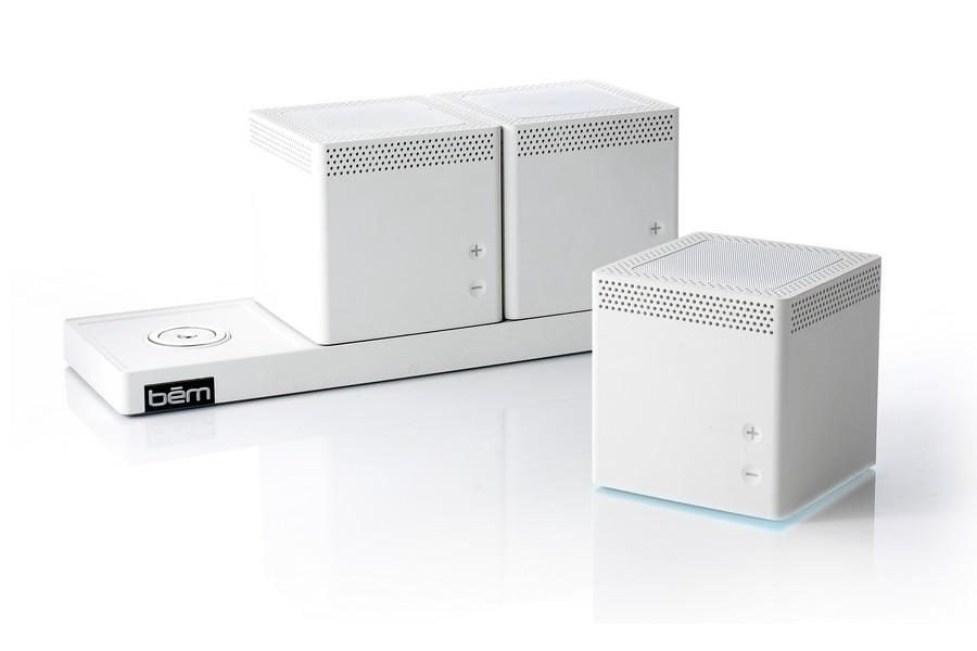Le bem Speaker Trio est un ensemble composé d'une base et de trois enceintes sans fil. La base communique en Bluetooth avec votre smartphone ou votre tablette. Les haut-parleurs possèdent une autonomie de 6 heures et se rechargent sur la base.