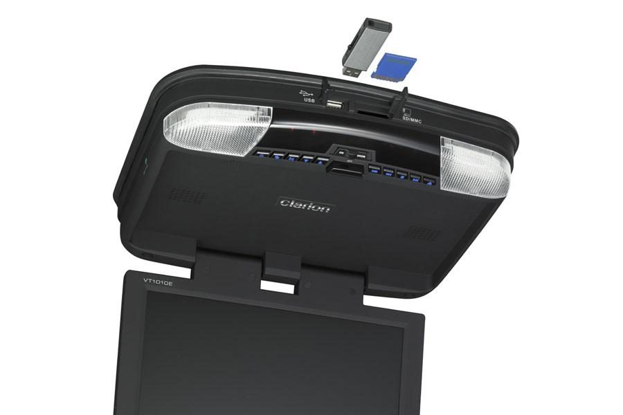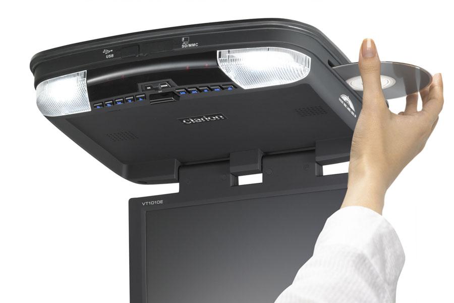 Clarion commercialise un lecteur de DVD et DivX haut de gamme pour la voiture, fixé au plafonnier par un spécialiste. Le VT101E possède un écran de 25 cm de diagonale et est livré avec deux casques stéréo sans fil.