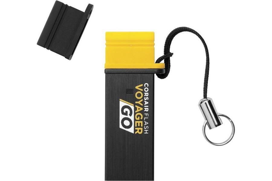 La Flash Voyager Go de Corsair est une toute petite clé USB 3.0 conçue pour se brancher aussi bien sur les PC que sur les smartphones et les tablettes Android. Elle dispose pourcela d'un connecteur mini USB protégé par un capuchon. Corsair livre un second capuchon et une attache pour porte-clés. Disponible dans des capacités de 16, 32 et 64 Go.