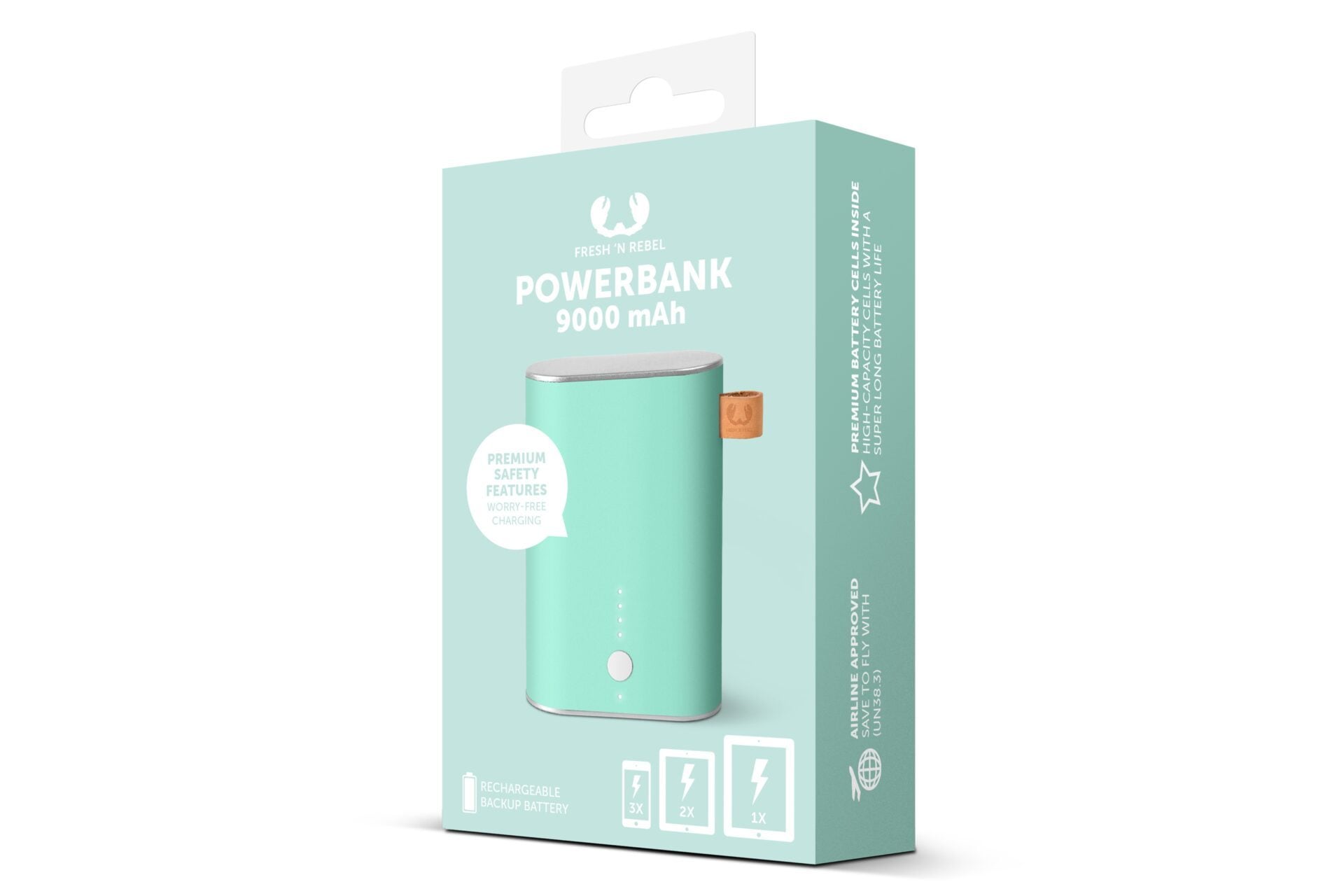 Fresh 'n Rebel Powerbank 9000 mAh - Peppermint, turquoise, métal, Universel, Micro-USB, 9000 mAh, USB