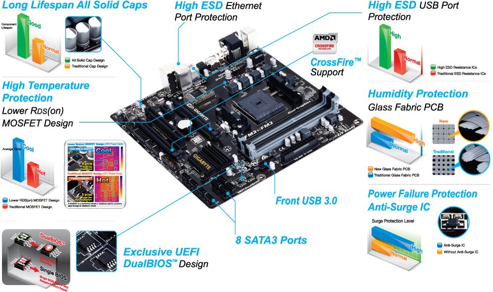 Gigabyte GA-F2A88XM-D3H, DDR3-SDRAM, DIMM, 1333,1600,1866,2133 MHz, Dual, 1.5 V, 64 Go
