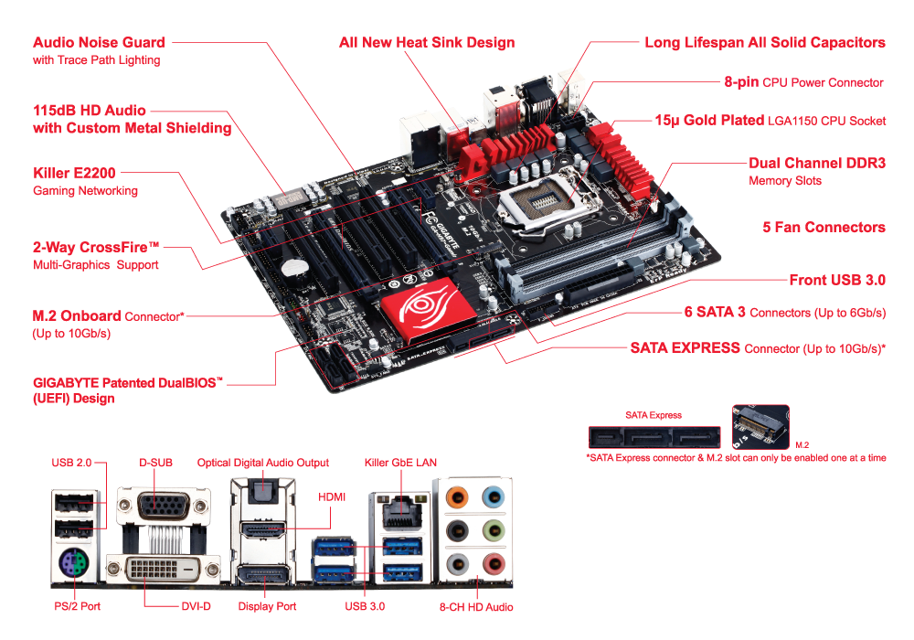 | Autres | Mémoire de type fentes: DIMM, Prise en charge de la mémoire vitesse d'horloge: 1333,1600 MHz, Canaux de mémoire: Dual, Non-ECC: Oui, Socket de processeur (réceptable de processeur): LGA 1150 (Socket H3), Nombre max. de processeurs SMP: 1, Connecteurs USB 2.0: 3, connecteurs USB 3,0 (3,1 Gen 1): 1, Interfaces de lecteur de stockage prises en charge: Série ATA III, Connecteur de sortie S/PDIF: Oui, Connecteur CPU FAN: Oui, Connecteur ATX (24-pin): Oui, Connecteur audio panneau avant: Oui, Connecteur d'alimentation du ventilateur: Oui, Connecteur TPM: Oui, Têtes port série: 1, Nombre de ports PS/2: 1, Nombre de ports VGA (D-Sub): 1, Quantité de ports DVI-D: 1, Quantité de ports HDMI: 1, Entrée jack microphone: Oui, Version HDMI: 1.4a, Contrôleur de réseau local (LAN): Atheros Killer E2201, composant pour: PC, Canaux de sortie audio: 7.1 canaux, Niveaux RAID: 1, 5, 10, Système audio: Realtek ALC1150, Fonctionnaités de l'Overlock: APP Center\n@BIOS\nEasyTune\nEZ Setup\nFast Boot\nGame Controller\nON/OFF Charge\nSmart TimeLock\nSmart Recovery 2\nSystem Information Viewer\nUSB Blocker\nQ-Flash\nSmart Switch\nXpress Install, Surveillance du bon fonctionnement PC: UC, Ventilateur, Alimentation électrique, Temperature, Taille de la mémoire vidéo: 512 Mo, Technologie de Traitement en parallèle: 2-Way CrossFireX, Résolution maximale: 4096 x 2160 pixels, Discret support graphique: Oui, Nombre d'affichages pris en charge: 3, PCI Express x1 emplacement: 2, PCI Express x16 emplacements: 2, Emplacements PCI: 3, Type de BIOS: UEFI AMI, Capacité de mémoire du BIOS: 16 Mo, Version ACPI: 5.0, Cavalier CMOS d'effacement: Oui, Logiciels fournis: Norton® Internet Security (OEM version)\nIntel® Rapid Start Technology\nIntel® Smart Connect Technology\nIntel® Smart Response Technology |