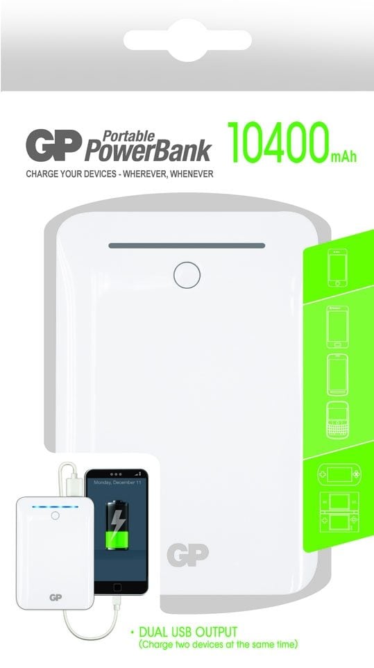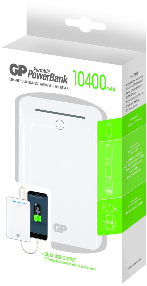 GP Batteries Portable PowerBank GL301, Blanc, Téléphone portable, MP3, Consoles portables, Tablette, Lithium-Ion (Li-Ion), 10400 mAh, USB, 3,7 V