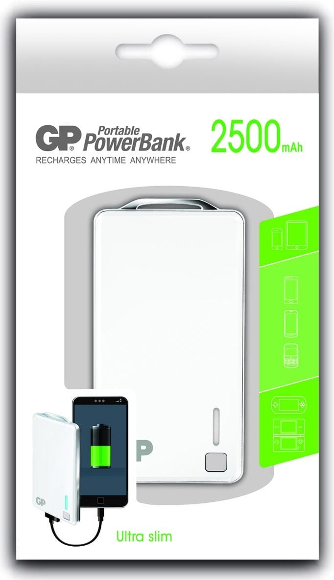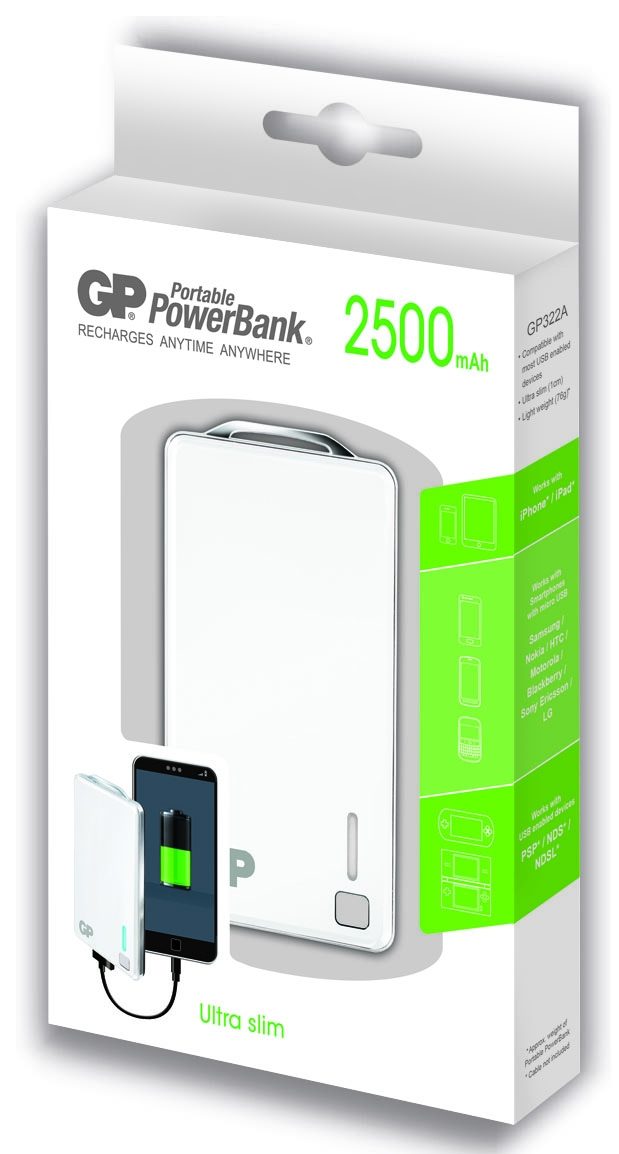 GP Batteries Portable PowerBank XPB28, Blanc, Téléphone portable, MP3, Consoles portables, Tablette, Lithium Polymère (LiPo), 2500 mAh, USB, 3,7 V