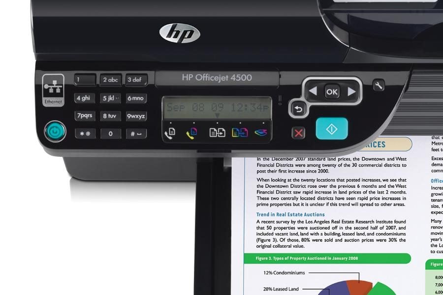 HP propose une imprimante jet d’encre couleur multifonction pour une utilisation à la maison ou en entreprise. L’Officejet 4500 bénéficie d’un scanner couleur à plat avec chargeur automatique de documents, d’une fonction fax et d’une interface Wi-Fi. En revanche, elle ne dispose pas de lecteur de cartes mémoire.