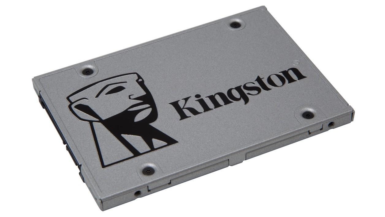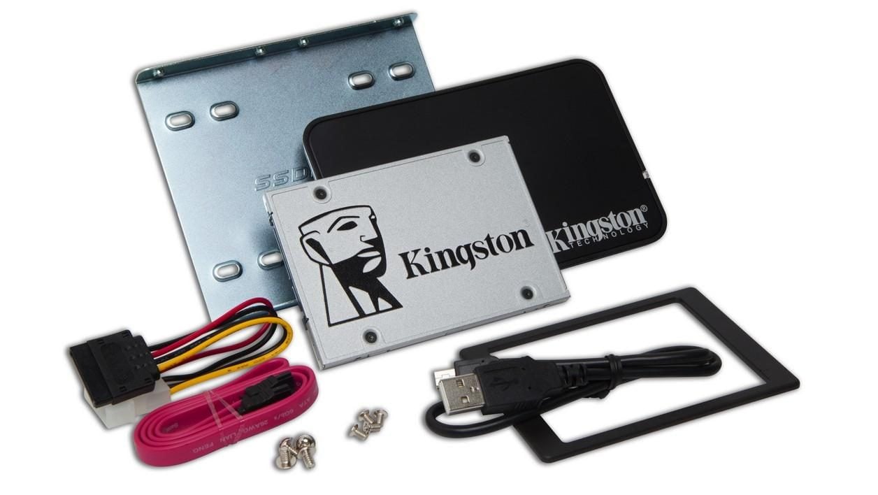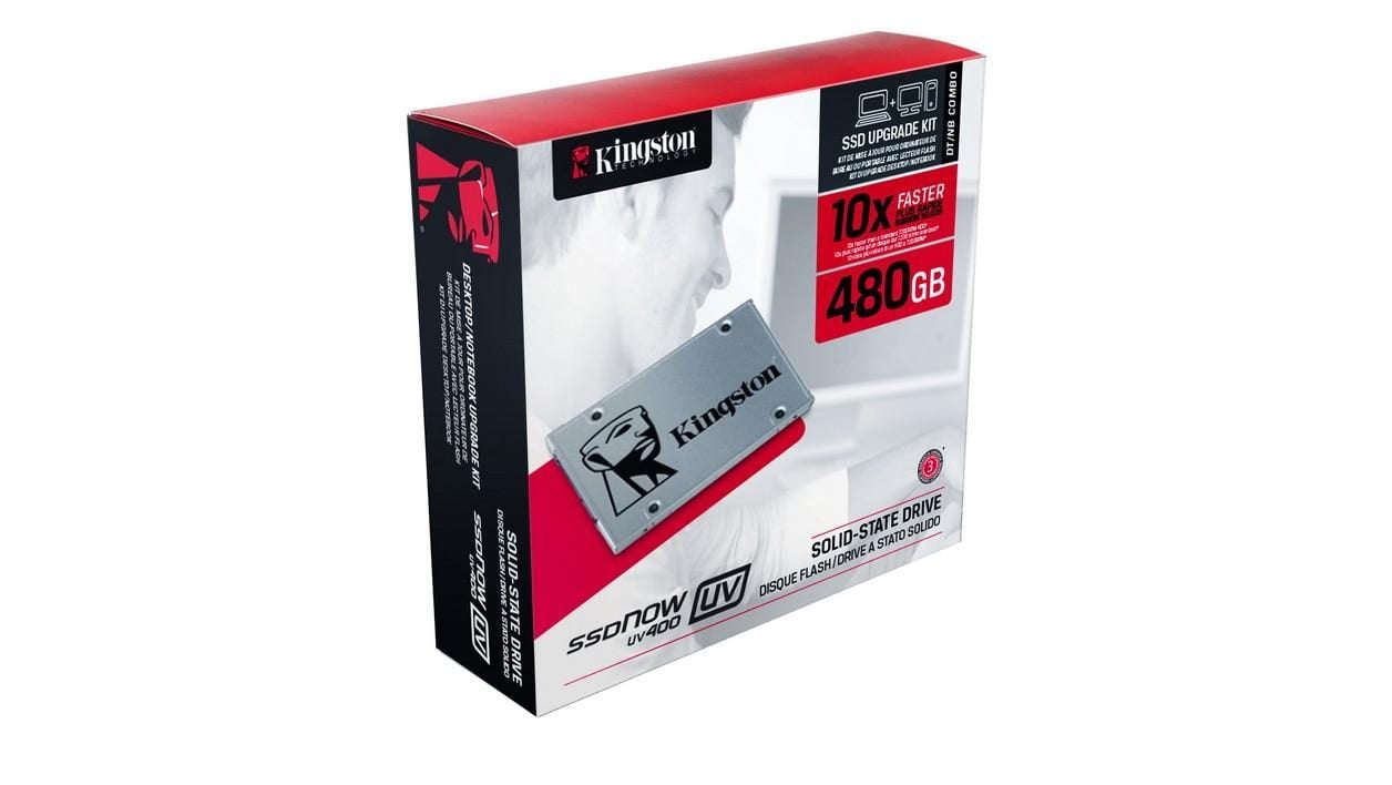 Le SSDNow UV400 de Kingston est un SSD doté de mémoire flash TLC (endurance totale 200 To). Il offre des débits théoriques de 550 Mo/s en lecture et 500 Mo/s en écriture. Il est vendu seul ou avec un kit de transfert complet comprenant, entre autres, un berceau 3,5 pouces, un boîtier USB 2.0, un cadre pour augmenter son épaisseur à 9,5 mm et un programme de clonage.