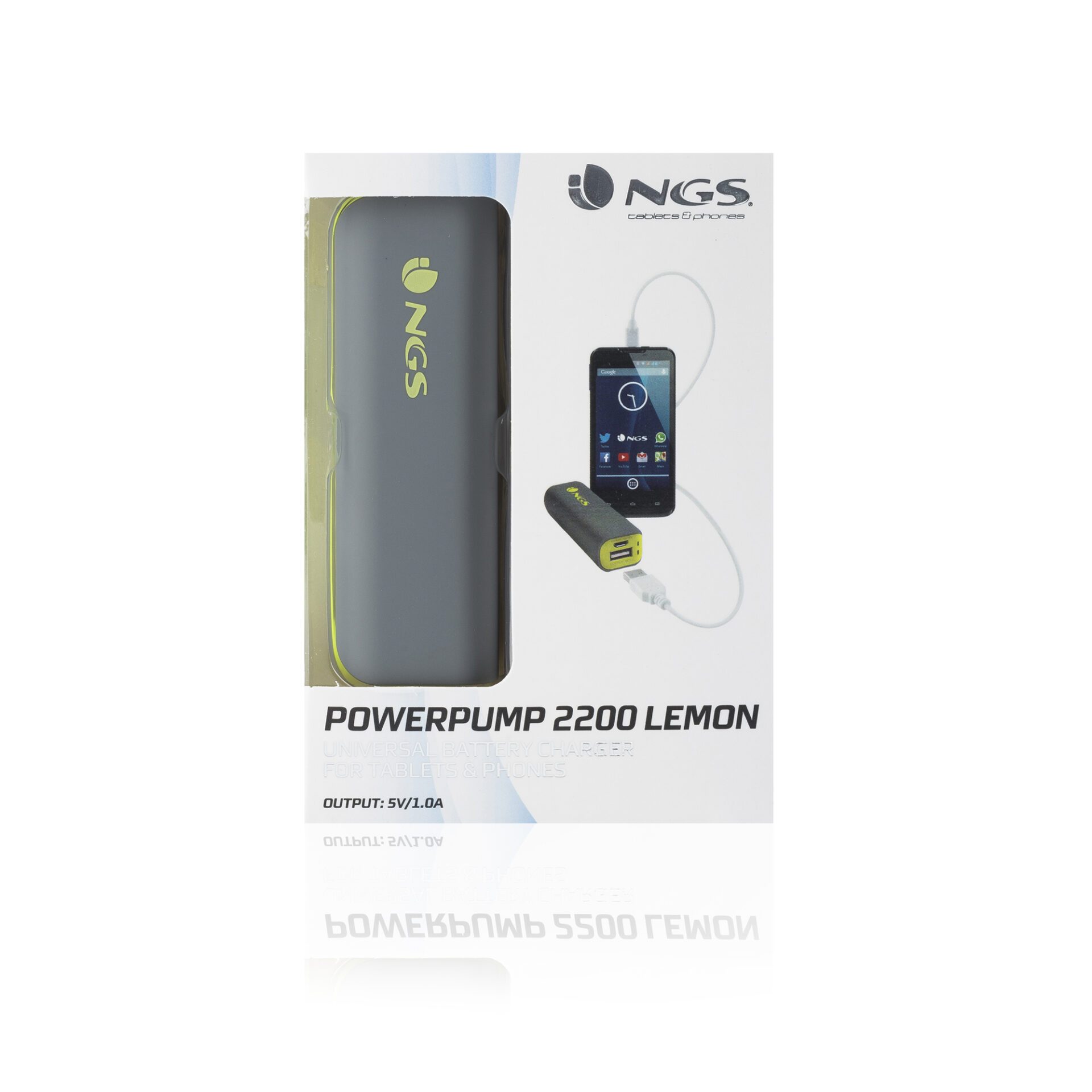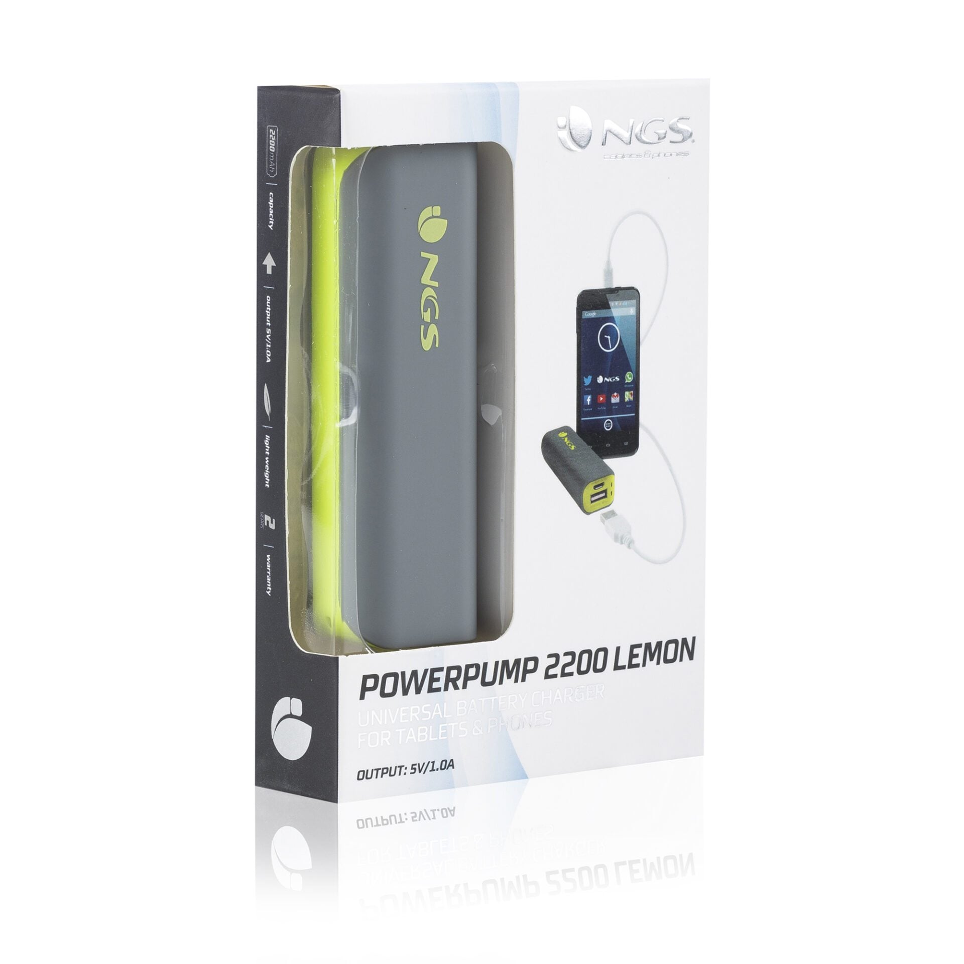 NGS PowerPump 2200 Lemon, Gris, Jaune, Tablette, Caméra Numérique, MP3, Autres, Smartphone, MP4, Lithium-Ion (Li-Ion), 2200 mAh, USB, 5 V