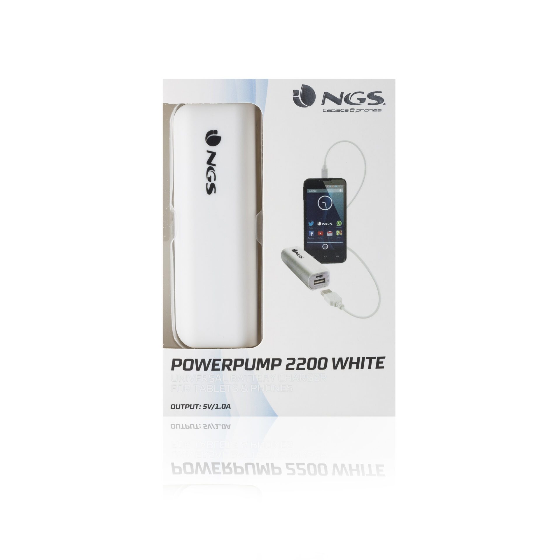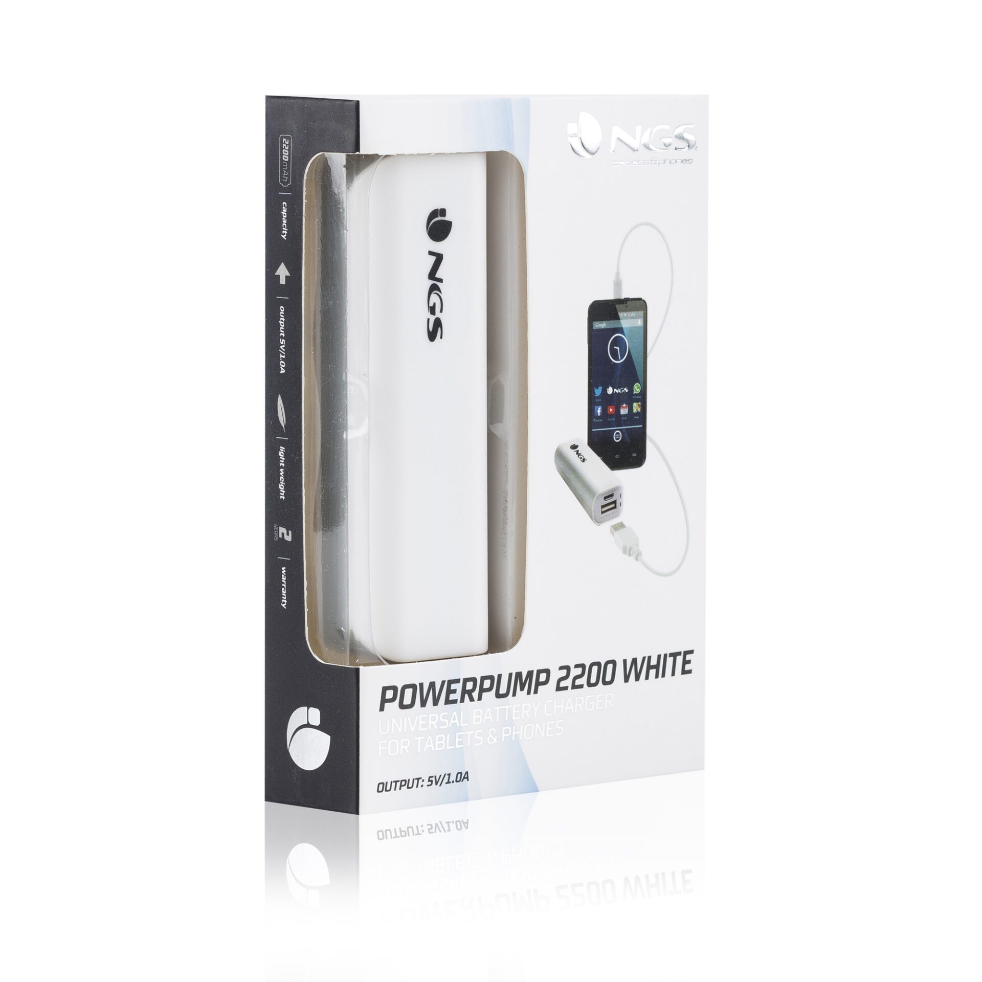 NGS PowerPump 2200 White, Gris, Blanc, Tablette, Caméra Numérique, MP3, Smartphone, MP4, Lithium-Ion (Li-Ion), 2200 mAh, USB, 5 V