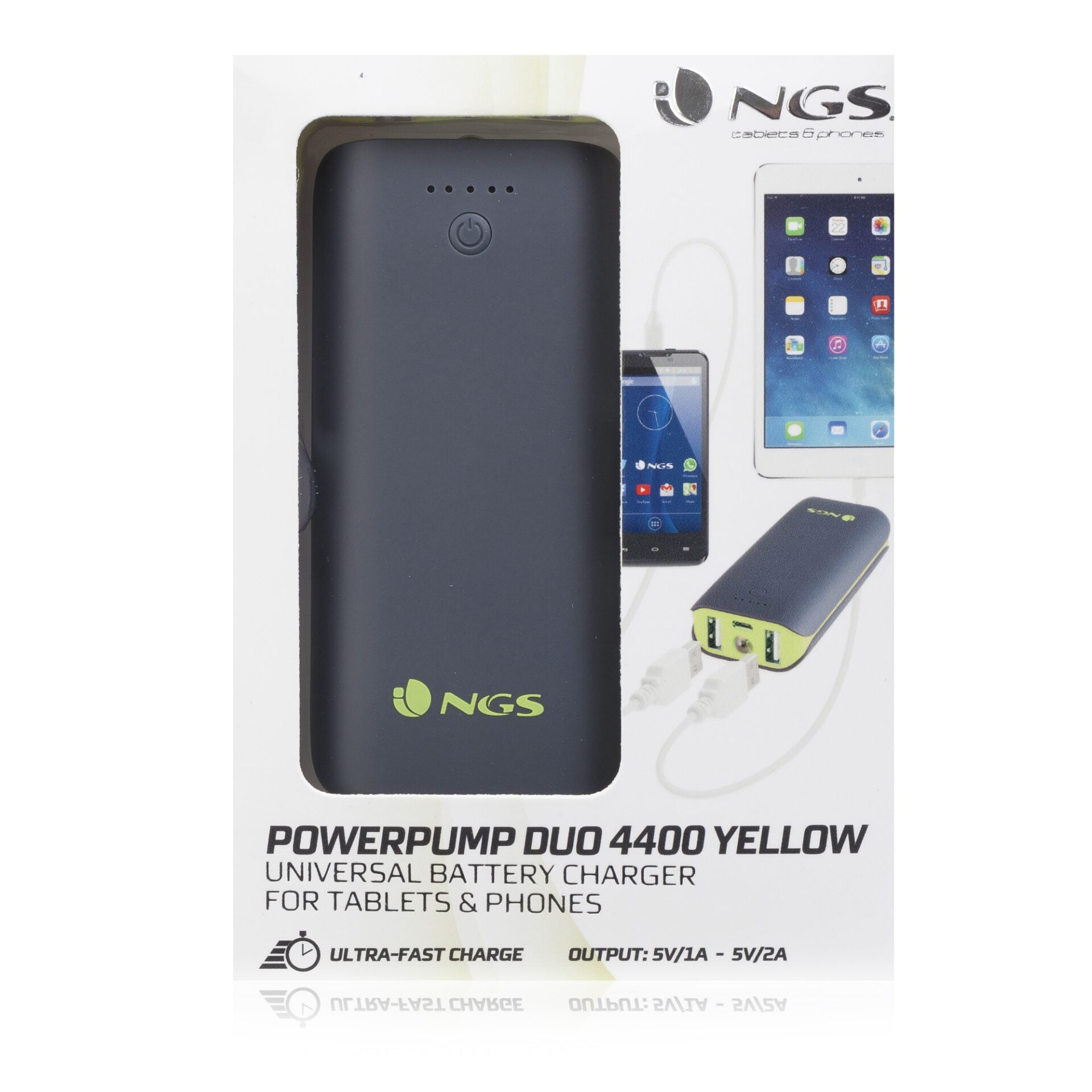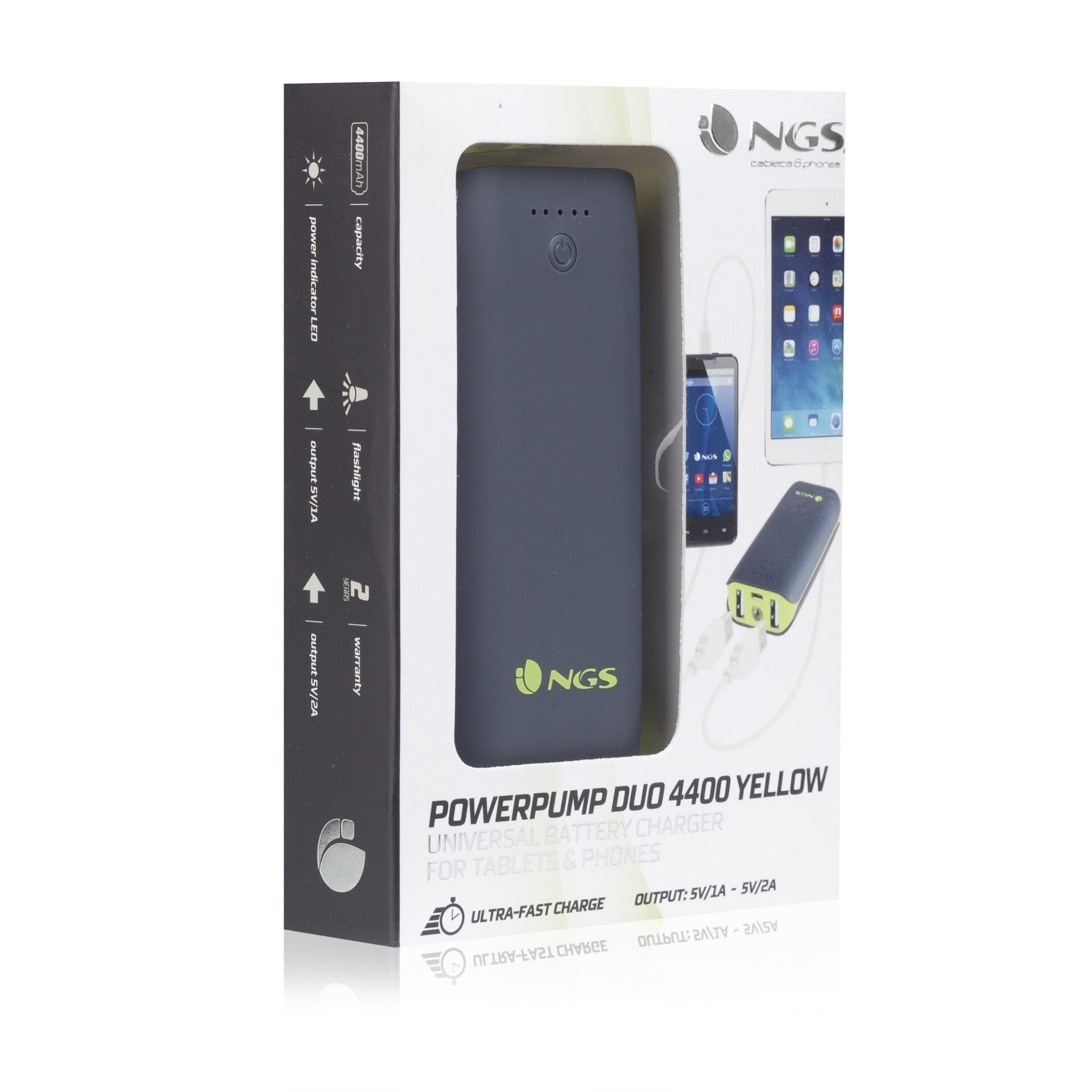 NGS PowerPump 4400 Duo, Noir, Jaune, Caméra Numérique, Lecteur e-book, Manettes de jeu, GPS, Microphone, MP3, MP4, Smartphone, Tablette, Micro-USB, Lithium-Ion (Li-Ion), 4400 mAh, USB