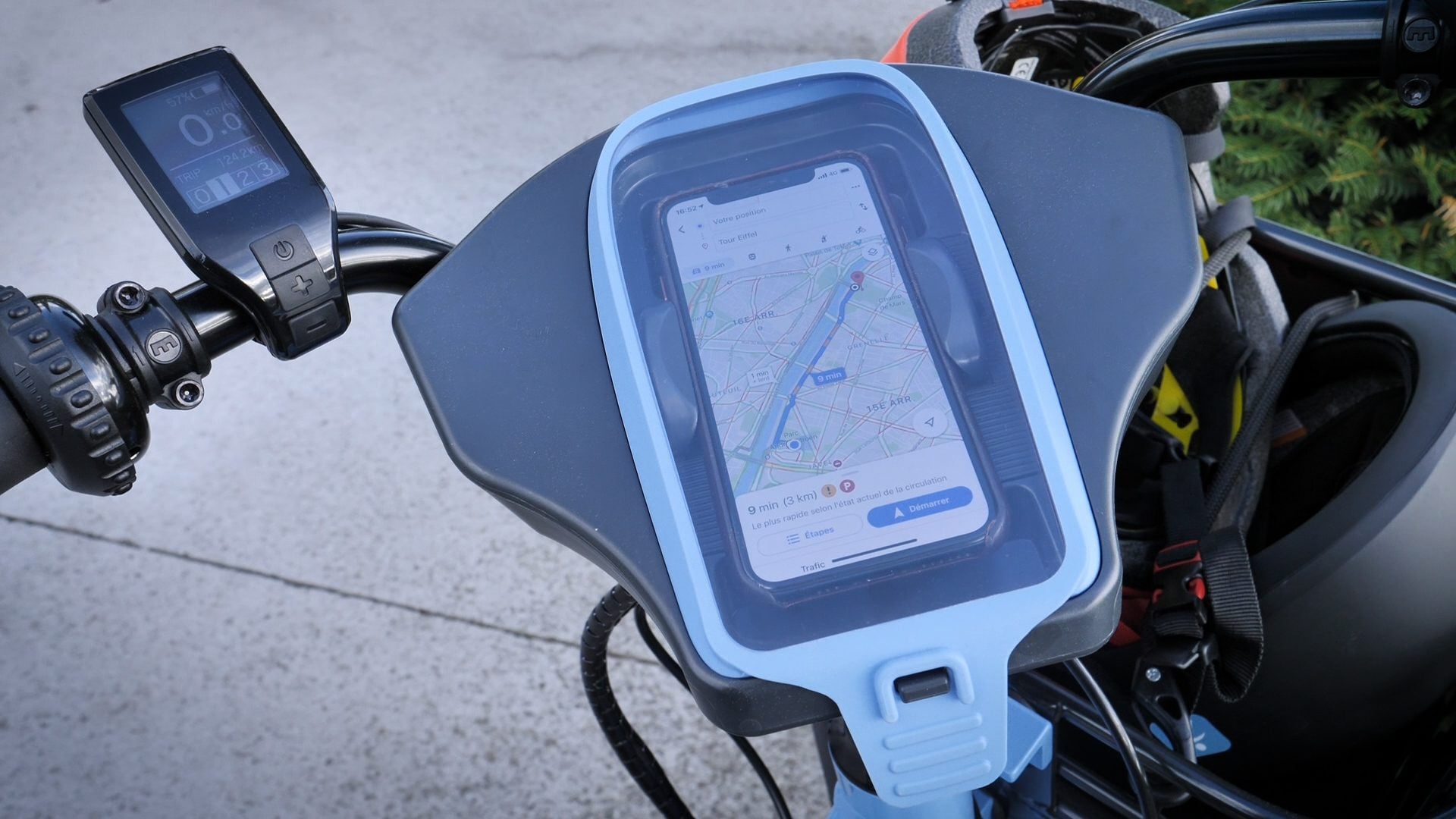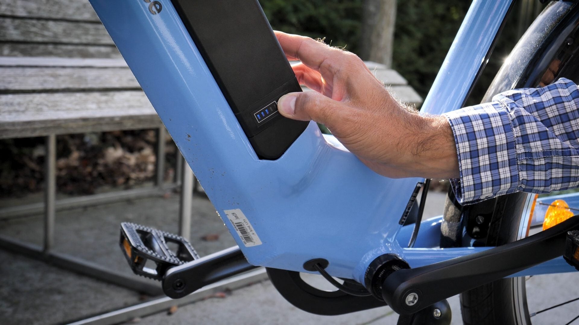 Au rayon des bonnes idées, il faut souligner la présence de ce boîtier dédié au smartphone. Non seulement il protège le téléphone contre la pluie mais il permet en plus de le recharger grâce à un port USB intégré. Ainsi, le smartphone peut être utilisé en GPS sans risque de casse et de manière sécurisée. Le système antivol du vélo mérite également d’être considéré. Il est composé d’une chaîne et d’un antivol de cadre assez classique. Celui-ci se verrouille et se déverrouille à l’aide d’une clé qu’il faut laisser en place lorsqu’on roule. Cette même clé qui subit donc les affres de la météo sert également à retirer la batterie. Et c’est l’autre bon point de Véligo, sa batterie est amovible. Il est donc possible de laisser son (lourd) vélo dans la rue et de le charger au domicile comme au travail.