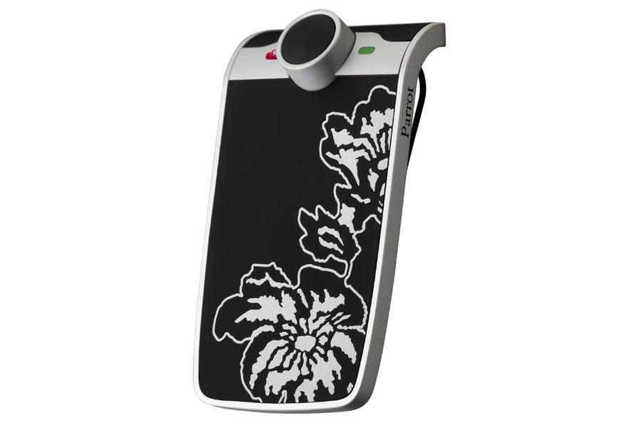 Le Minikit Primavera est un kit Bluetooth de Parrot en édition limitée dont la seule particularité se situe au niveau du design : des fleurs argentées viennent casser la bichromie noire et blanche.