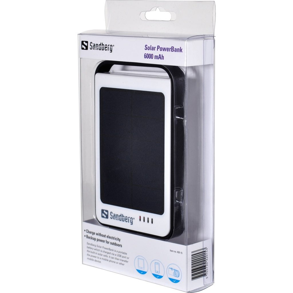 Sandberg Solar PowerBank 6000 mAh, Noir, Blanc, Téléphone portable, Smartphone, Micro-USB, 6000 mAh, Solaire, USB, 5 V