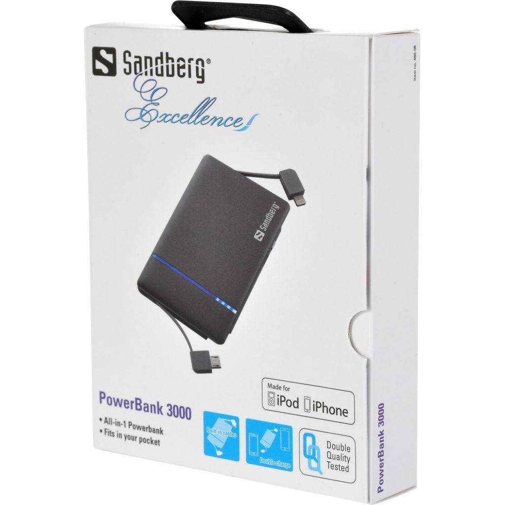 Sandberg Excellence PowerBank 3000, Noir, Smartphone, Micro-USB, Lithium Polymère (LiPo), 3000 mAh, USB