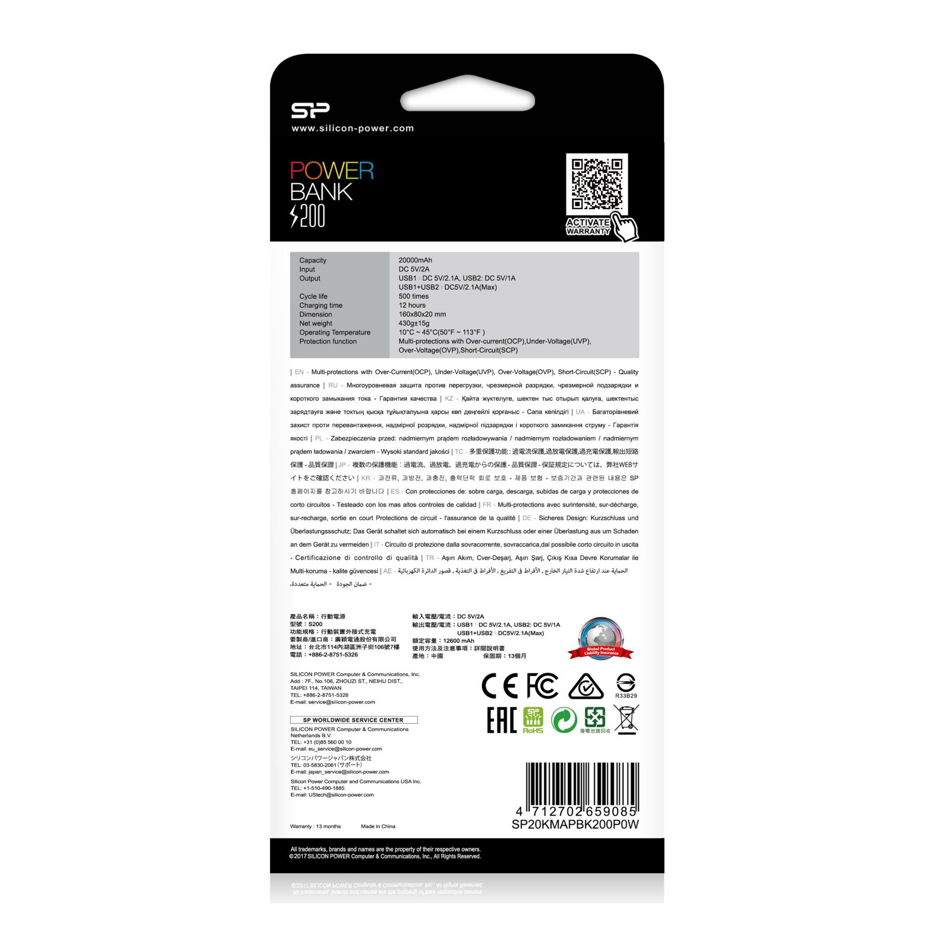 Silicon Power Power S200, Blanc, MP3/MP4, Mobile/smartphone, Tablette, Chargement, Micro-USB, Lithium Polymère (LiPo), 20000 mAh