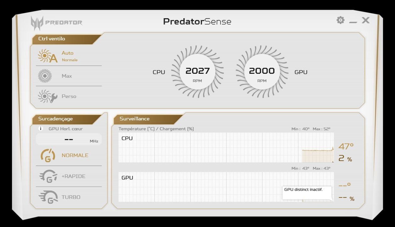 Deux niveaux de boost préprogrammés par Acer sont proposés, activables d’un simple clic de souris. Cependant, ne vous attendez pas à multiplier par deux le nombre d’images par seconde obtenu dans les jeux. Au mieux, nous avons constaté une petite augmentation de 5 à 6 ips entre le mode Normal et le mode Turbo suivant les jeux, la puce 3D montant au maximum à 1900 MHz (contre 1670 MHz annoncés par Nvidia).