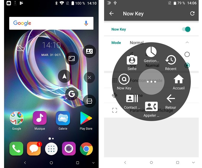 La surcouche Joy UI comporte également la fonction Now Key qui fait apparaitre un bouton virtuel que l’on peut placer n’importe où sur l’écran. En appuyant sur ce bouton, on accède rapidement à des fonctions qu’il est possible de personnaliser. Citons par exemple les contacts, la capture d’écran, Google Voice ou Google Maps.