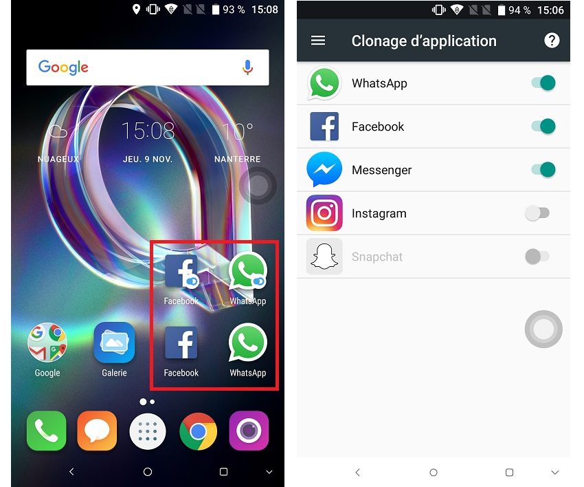 Simple à mettre en œuvre, cette fonction est plutôt pratique. Sur le modèle double SIM que nous avons reçu pour test, elle concerne cinq applis : Facebook, Messenger, WhatsApp, Instagram et Snapchat. Signalons que WhatsApp ne peut pas être clonée sur l’Idol 5 simple SIM car l’appli a besoin, pour chaque compte, d’être associée à un numéro de téléphone unique.