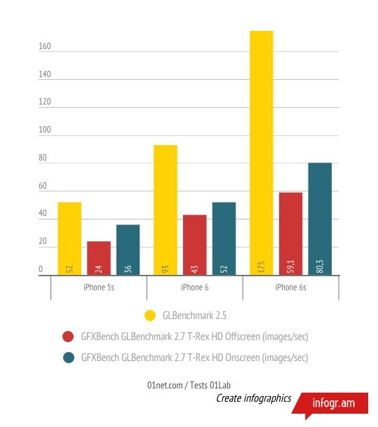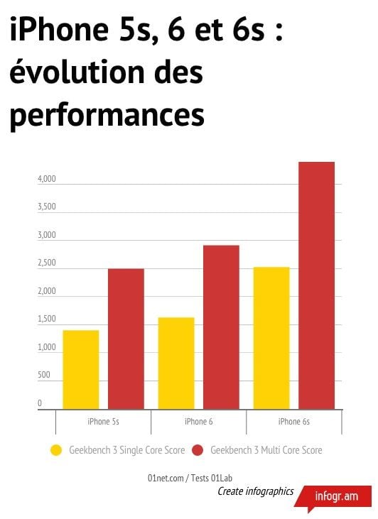 Ainsi, avec GLBenchmark 2.5, l’iPhone 6s affiche un gain de performances de 88% en comparaison des résultats obtenus avec l’iPhone 6, l’année dernière. 3DMark Ice Storm Unlimited, qui se concentre également sur la partie graphique, enregistre une hausse de plus de 61% des résultats une fois le test bouclé. Geekbench 3 et AnTuTu Benchmark, qui sont deux outils dont les tests mettent à l’épreuve aussi bien le CPU que le GPU, indiquent que l’iPhone 6s est, respectivement, 51% et 26,7% plus rapide que son aîné.